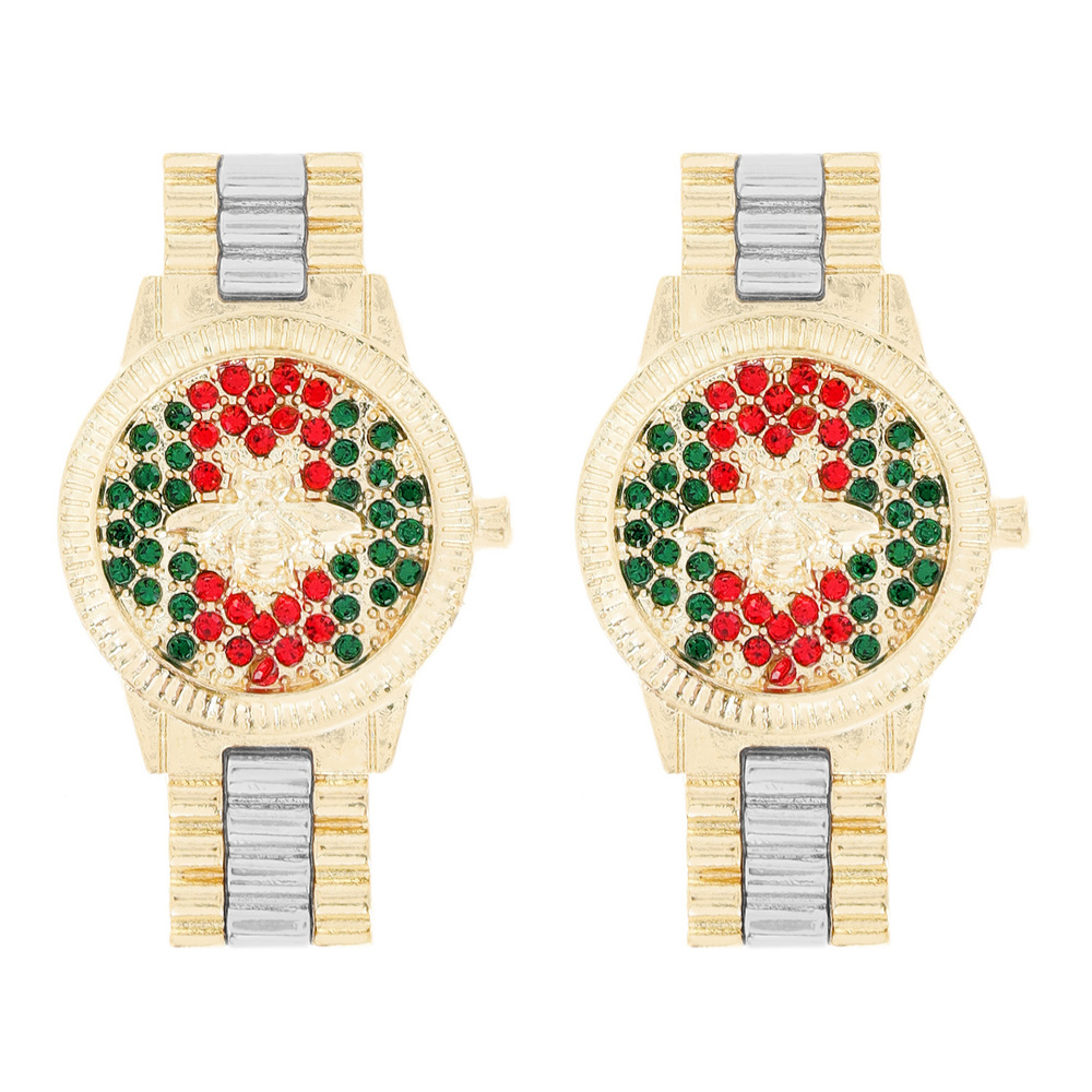 Bee Green And Red Rhinestone Wrist Watch Clock Drop Earrings