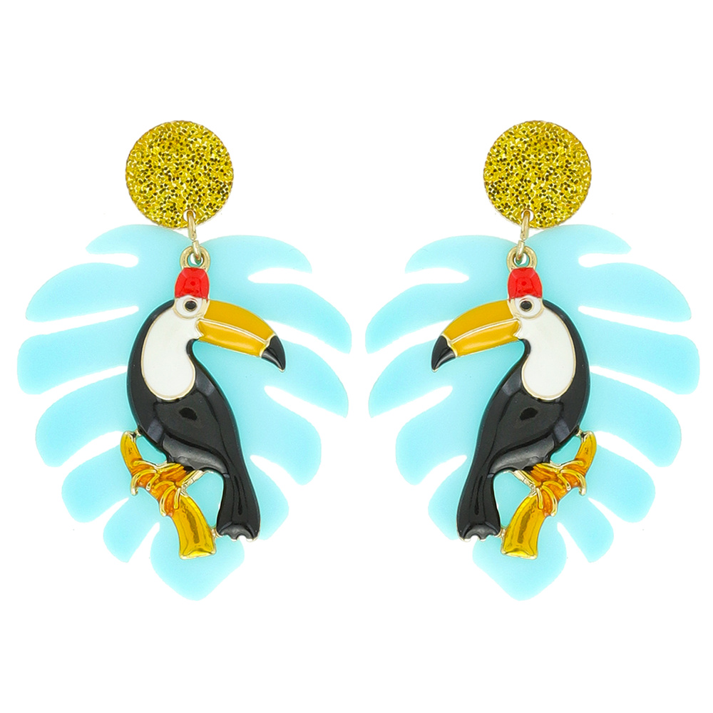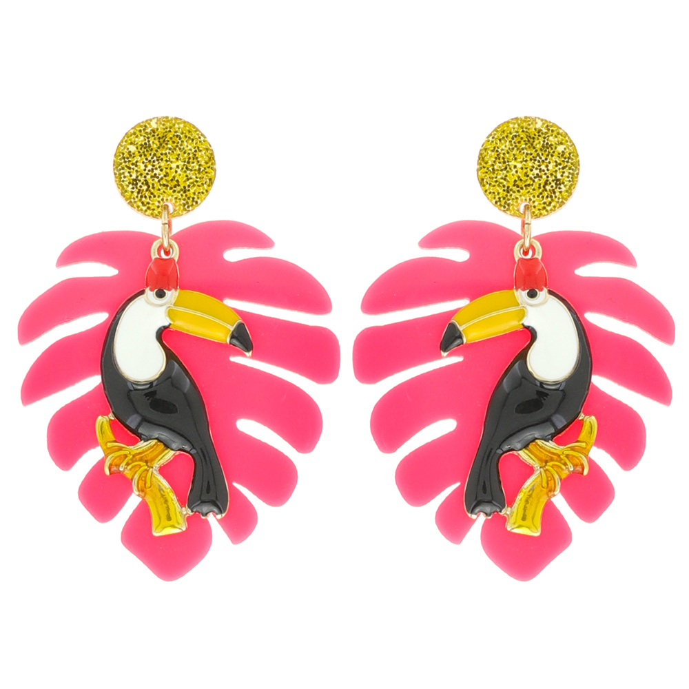 ENAMEL AND ACRYLIC TROPICAL PALM LEAF TOUCAN DANGLE EARRINGS