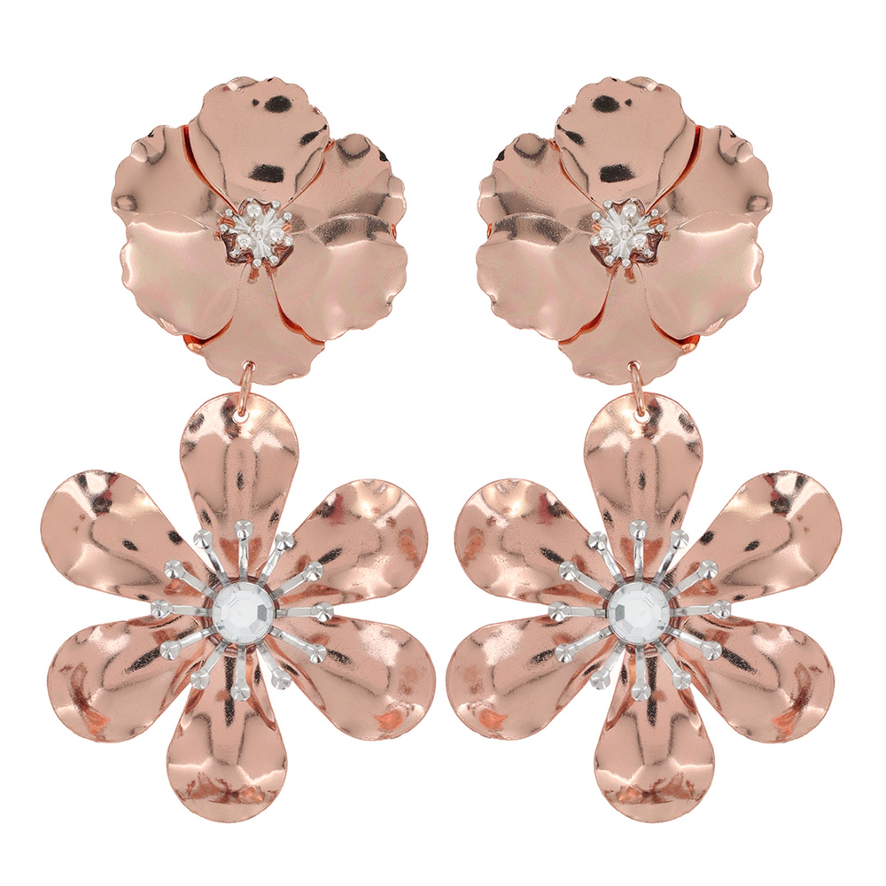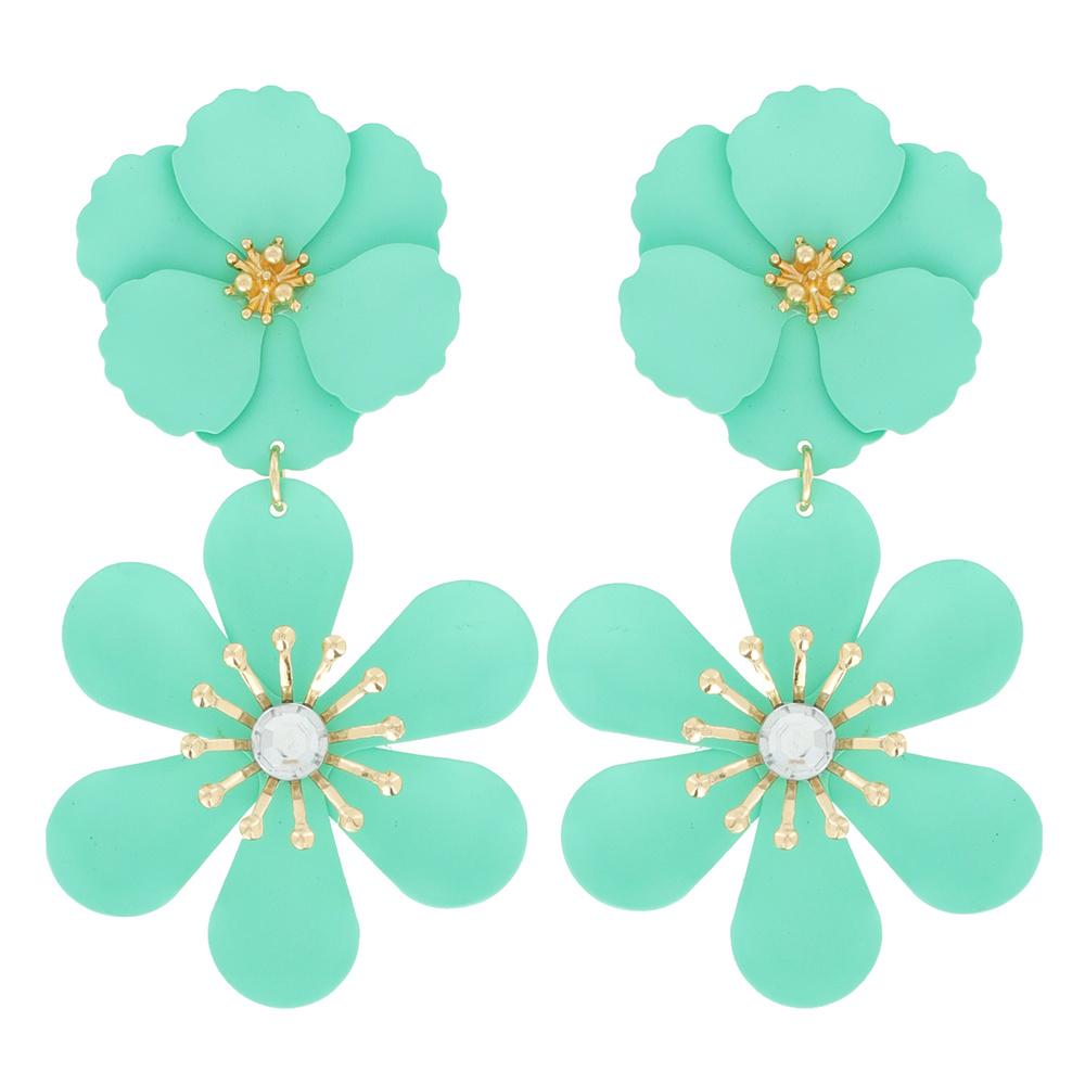 2-TIER ACRYLIC FLOWER DROP EARRINGS WITH GOLD TONE RHINESTONE CENTER