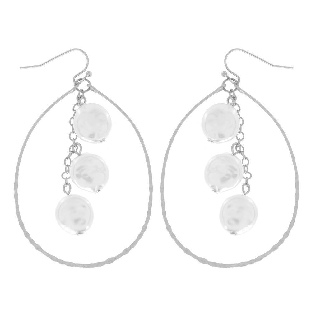 Boho Style Hammered Metal Open Teardrop Pearl Charm Fish Hook Dangle Earrings