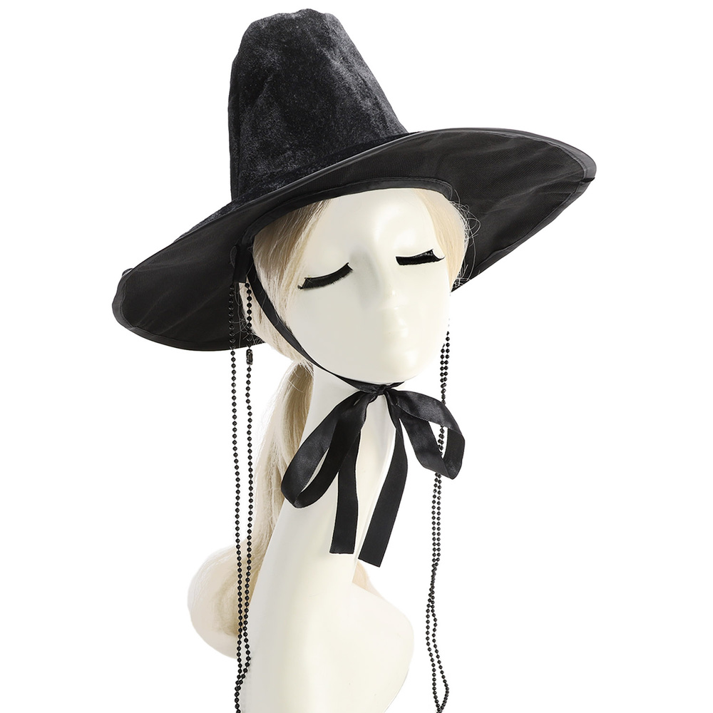 BLACK WIDE BRIM KOREAN STYLE HAT VELVET TEXTURE WITH DECORATIVE BEAD STRINGS