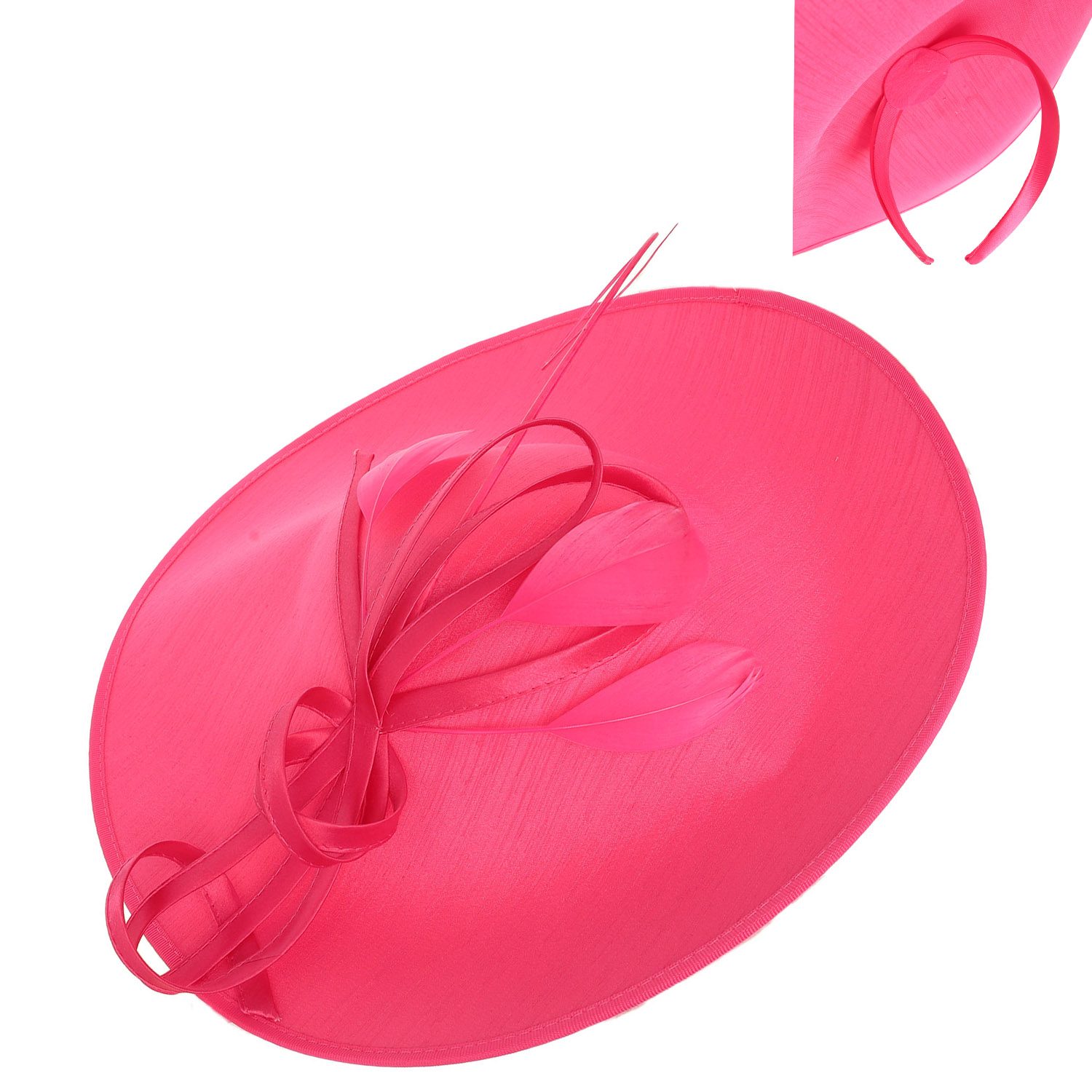 WIDE BRIM SAUCER FASCINATOR WITH SATIN RIBBON LOOPS AND FEATHER ON COMFORT HEADBAND BASE