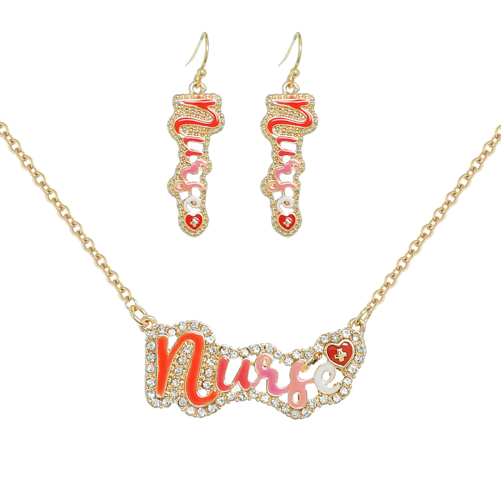 "NURSE" NURSE'S APPRECIAITON CRYSTAL RHINESTONE ENAMEL COATED CURSIVE LETTER ADJUSTABLE PENDANT NECKLACE EARRING SET