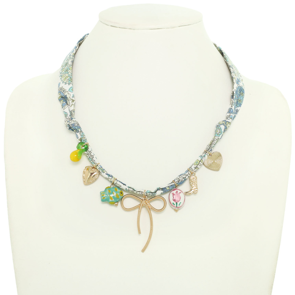 BRAIDED FABRIC NECKLACE WITH MIXED CHARMS AND LARGE BOW PENDANT