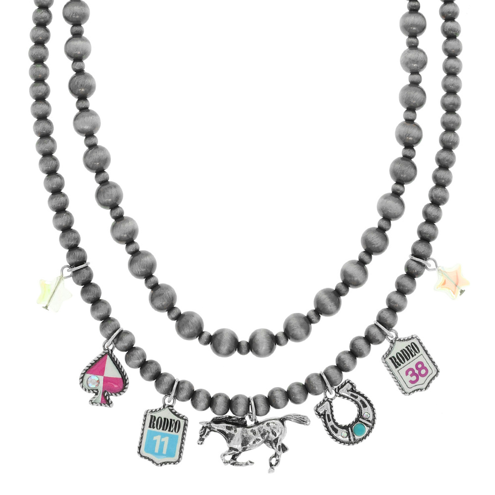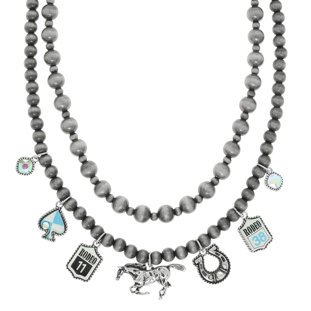 WESTERN MULTI STRAND CHARM NECKLACE WITH MIXED CHARMS AND TURQUOISE CRYSTAL ACCENTS