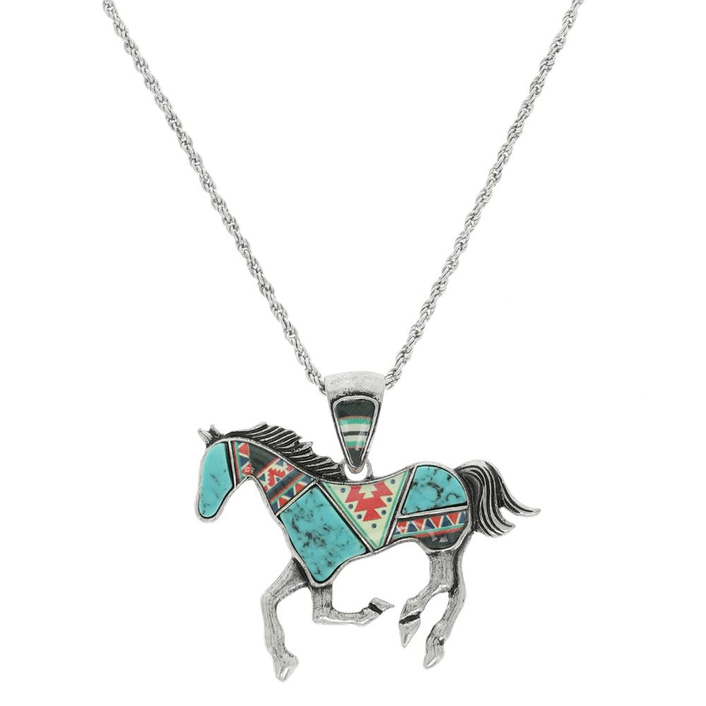 WESTERN TURQUOISE HORSE PENDANT NECKLACE WITH AZTEK PRINT DETAILING