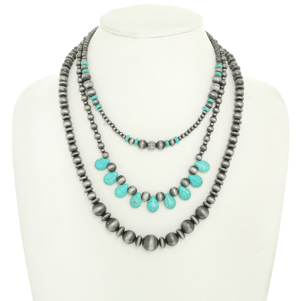 WESTERN MULTI STRAND BEADED NECKLACE WITH TURQUOISE AND OXIDIZED SILVER TONE BEADS