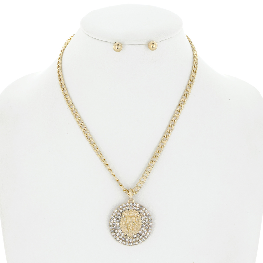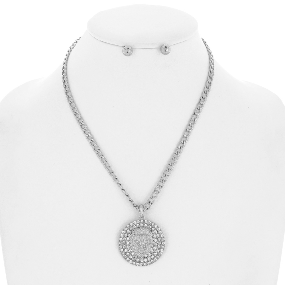 CRYSTAL RHINESTONE LION PENDANT NECKLACE AND EARRINGS SET