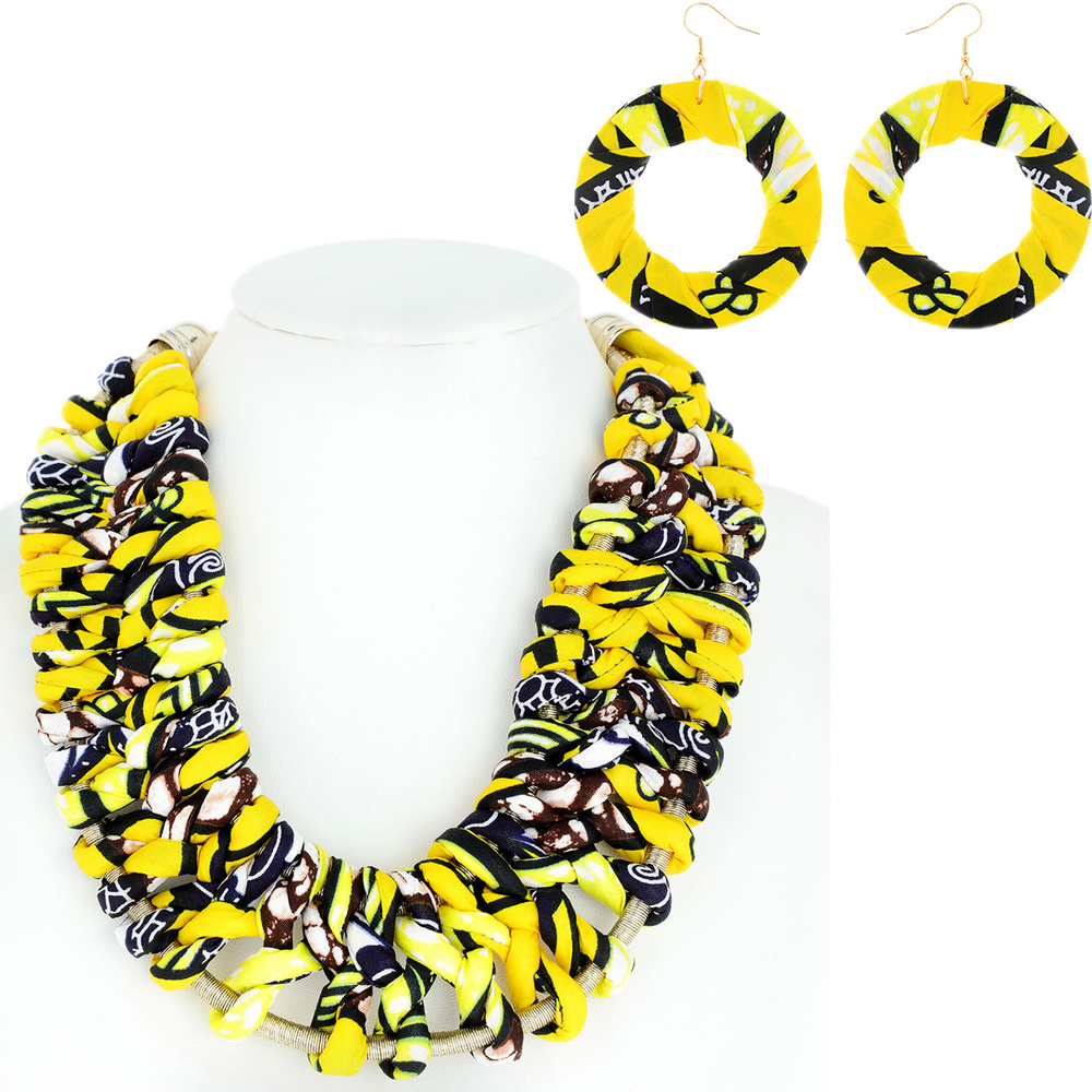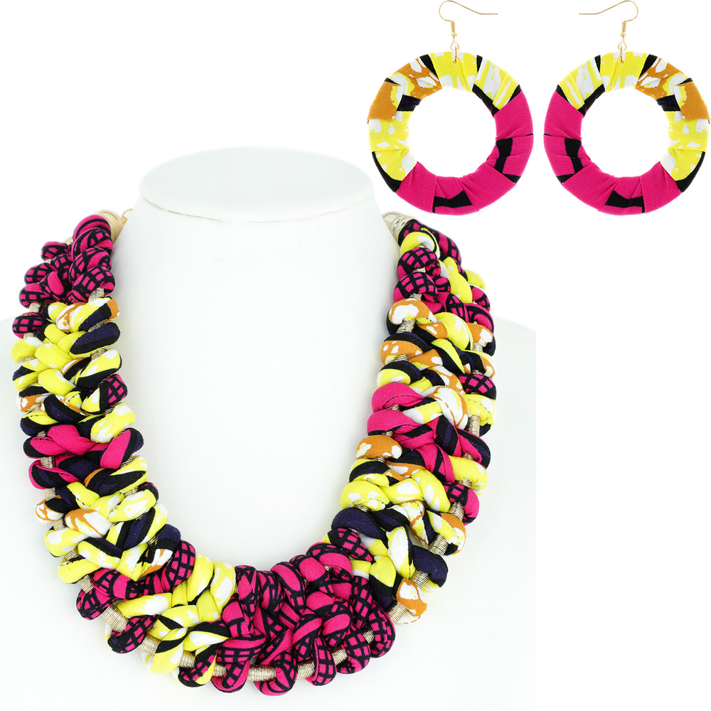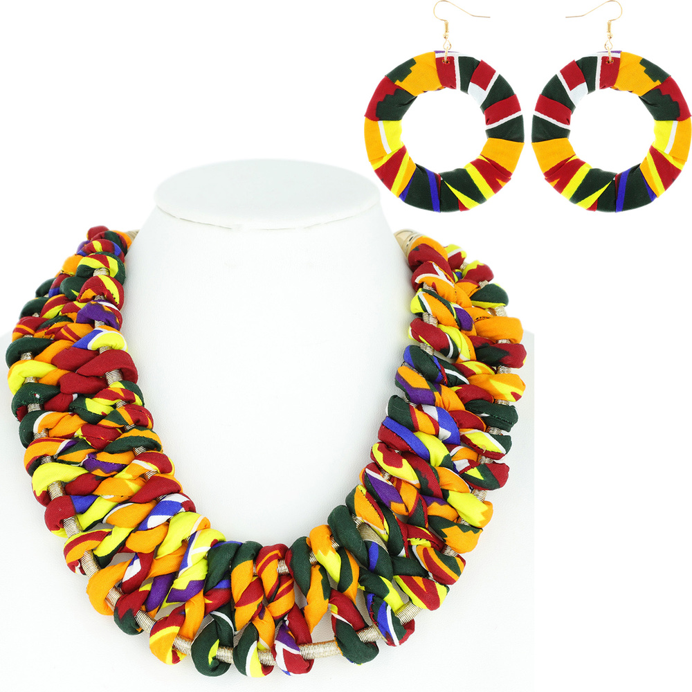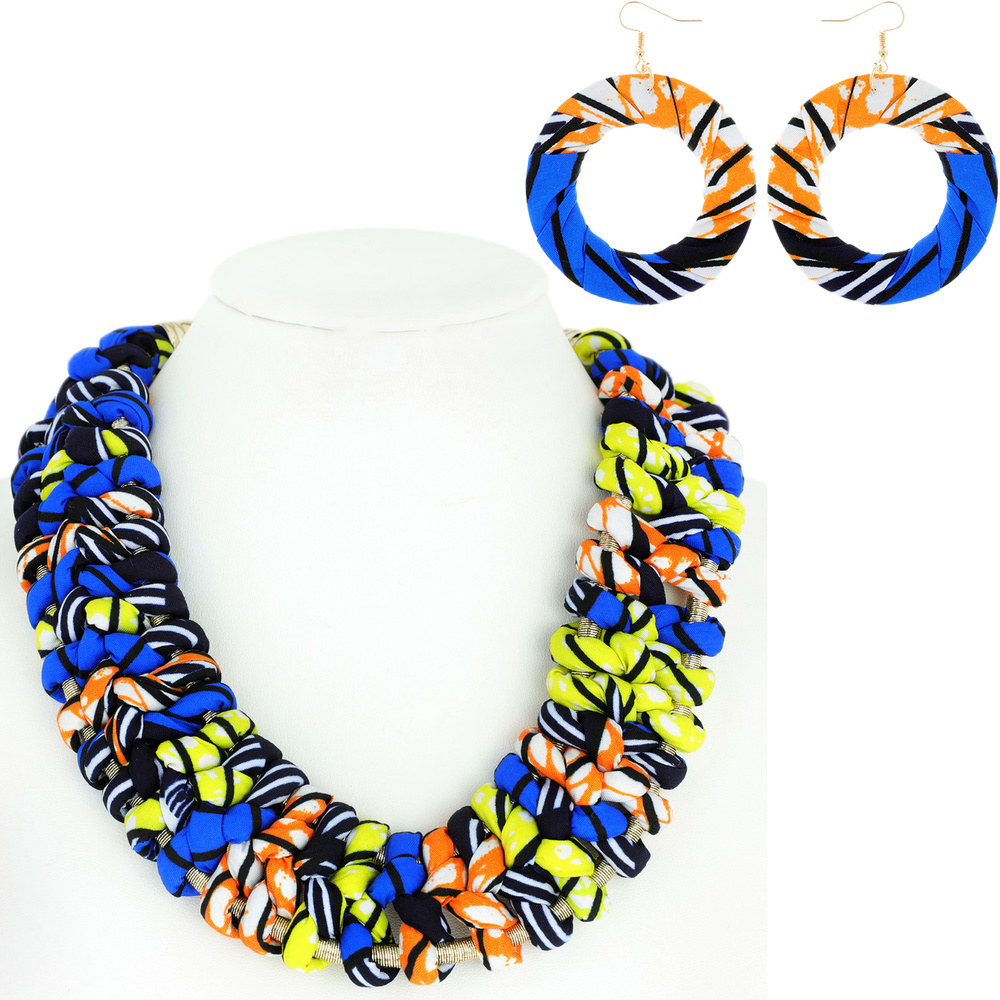 ANKARA AFRICAN PRINT FABRIC BRAIDED BIB NECKLACE AND HOOP EARRINGS SET