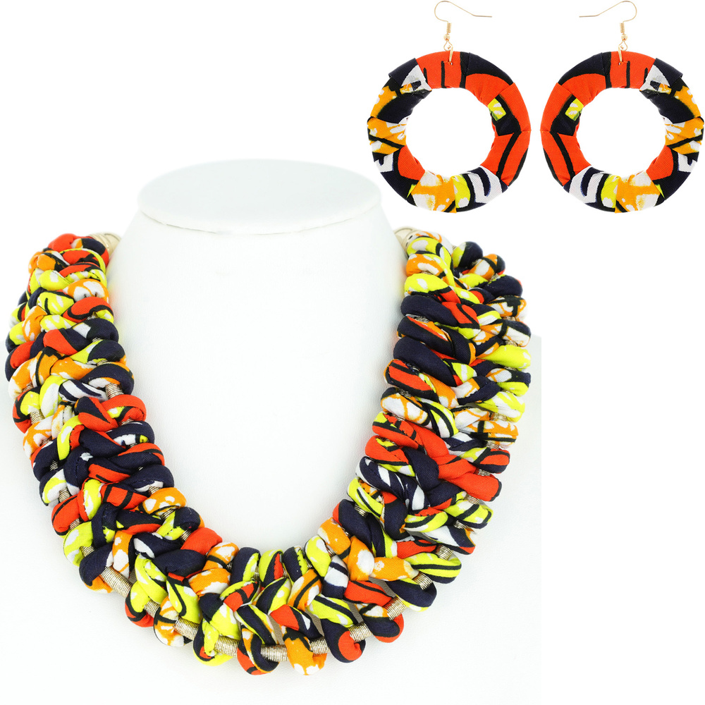 Ankara African Print Fabric Braided Bib Necklace And Hoop Earrings Set