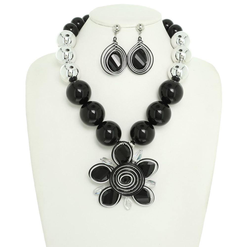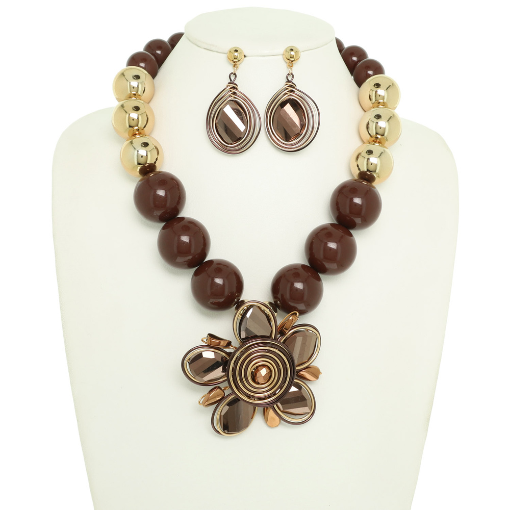 FLOWER PENDANT BALL BEADED NECKLACE SET WITH CRYSTAL EARRINGS NECKLACE