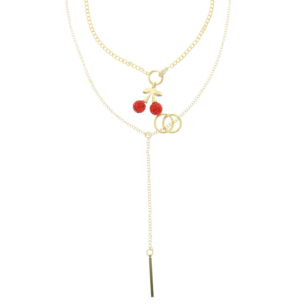 MULTI LAYERED NECKLACE WITH RED CHERRY PENDANT GREEN LEAF DETAIL GOLD TONE RINGS AND BAR CHARM