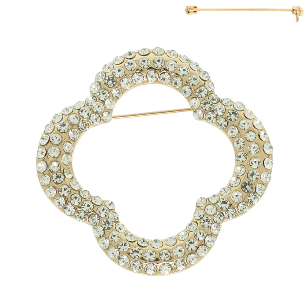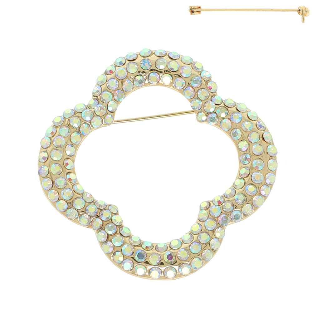 RHINESTONE PAVE CUTOUT QUATREFOIL CLOVER BROOCH PIN IN SILVER TONE METAL
