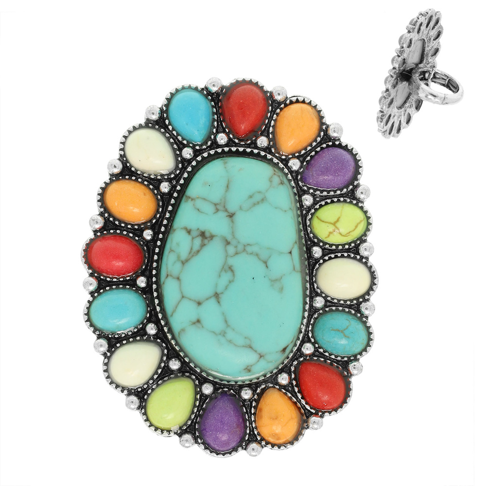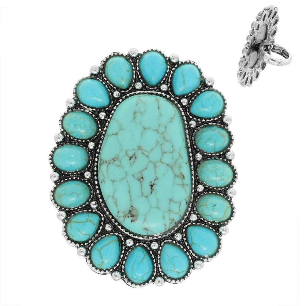 WESTERN OVAL TURQUOISE STRETCH RING WITH DECORATIVE BEADED FRAME