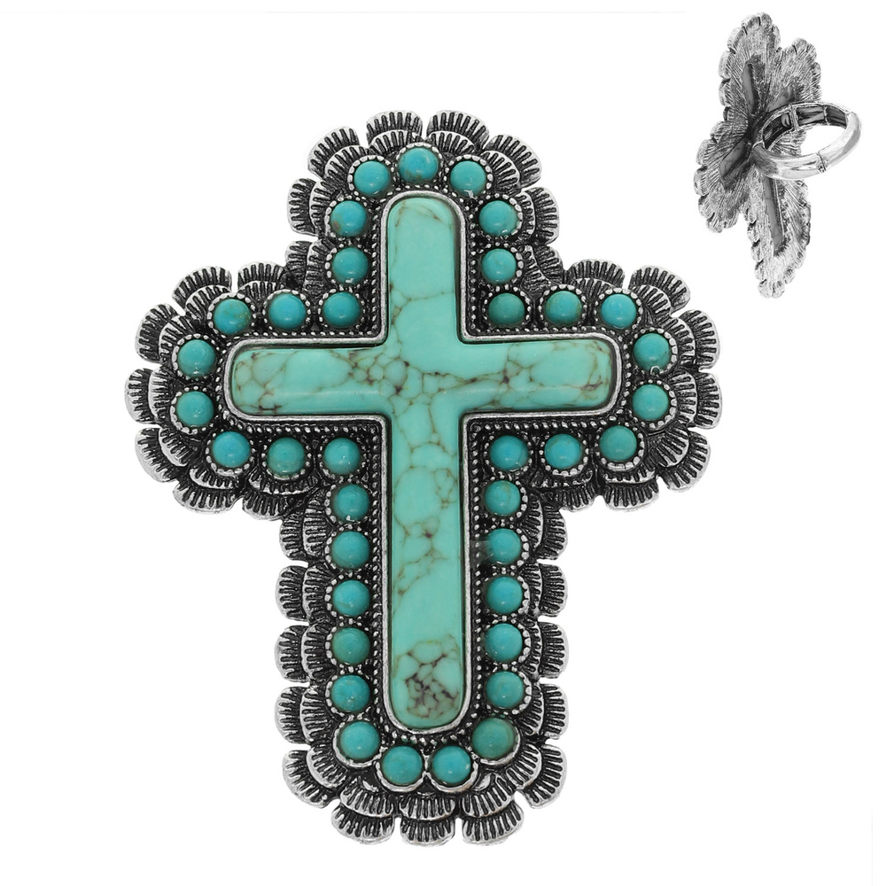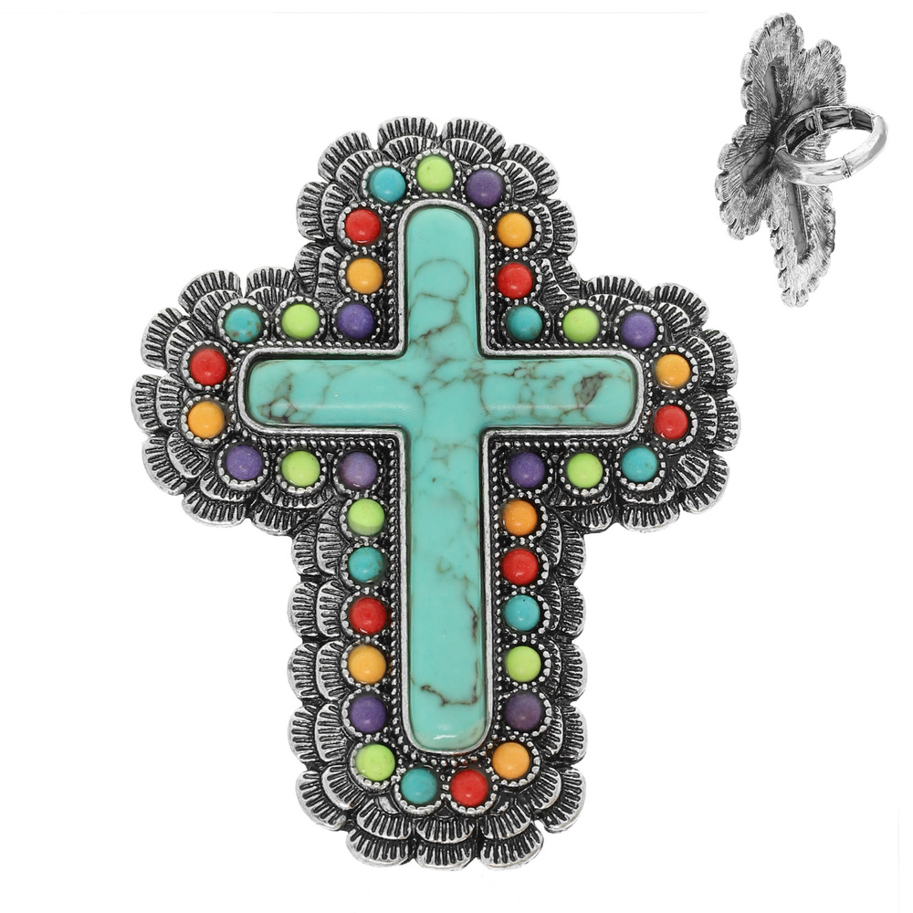 WESTERN TURQUOISE CROSS STRETCH RING WITH DECORATIVE BEADED FRAME