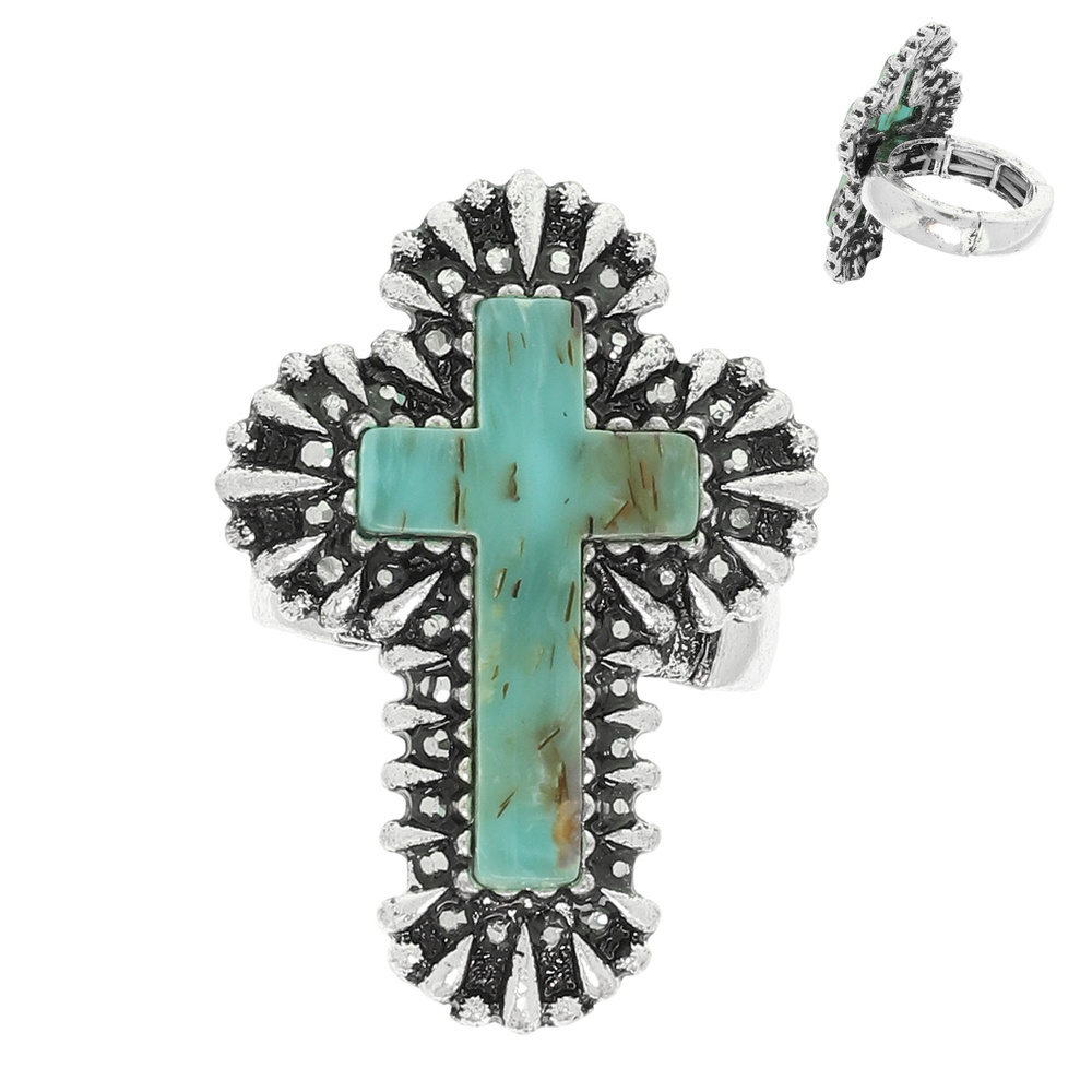 WESTERN TURQUOISE CROSS STRETCH RING WITH DECORATIVE FRAME IN OXIDIZED SILVER TONE METAL