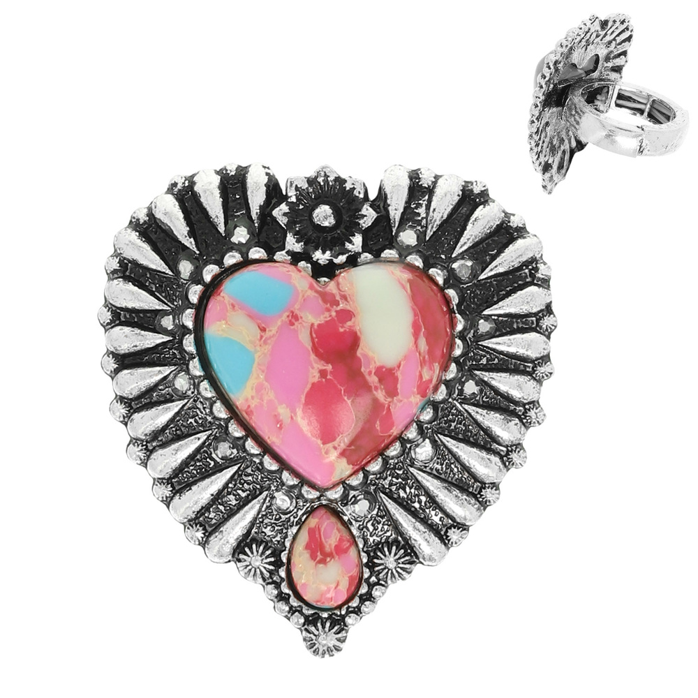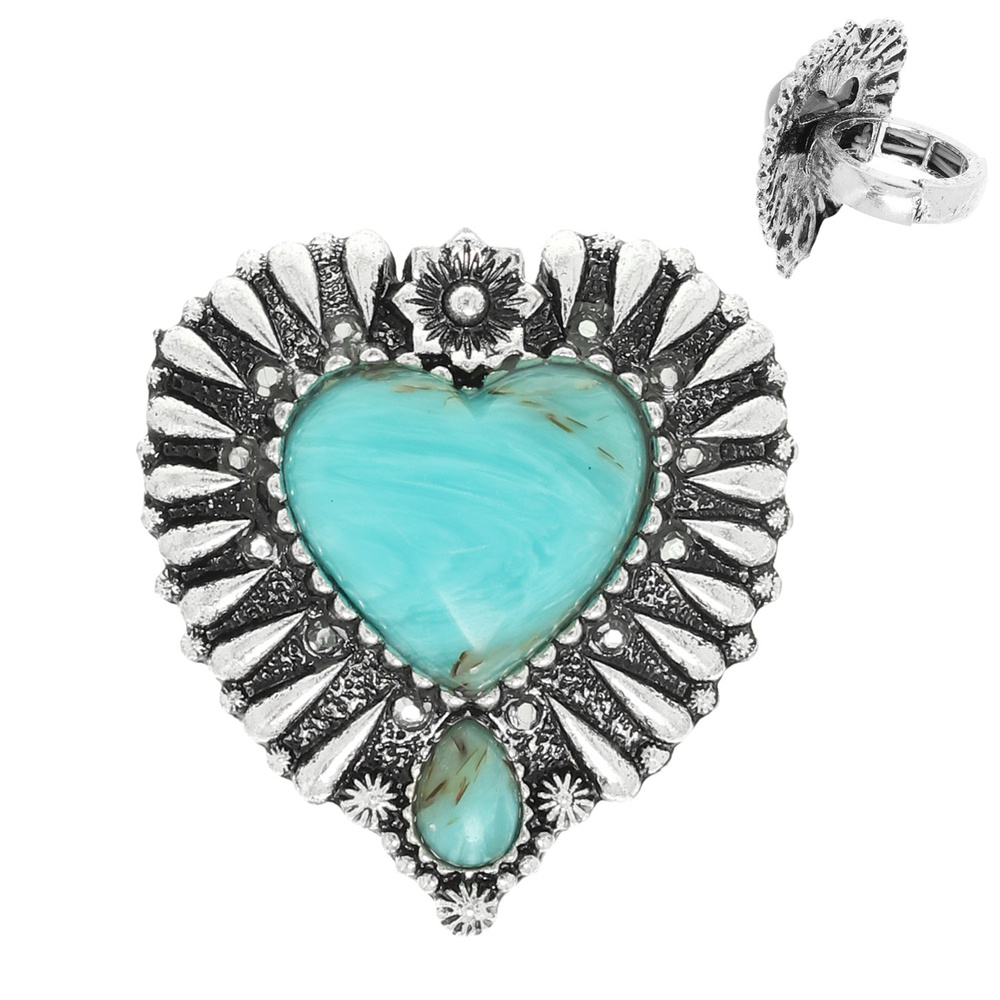 WESTERN MULTICOLOR TURQUOISE HEART STRETCH RING WITH DECORATIVE FRAME