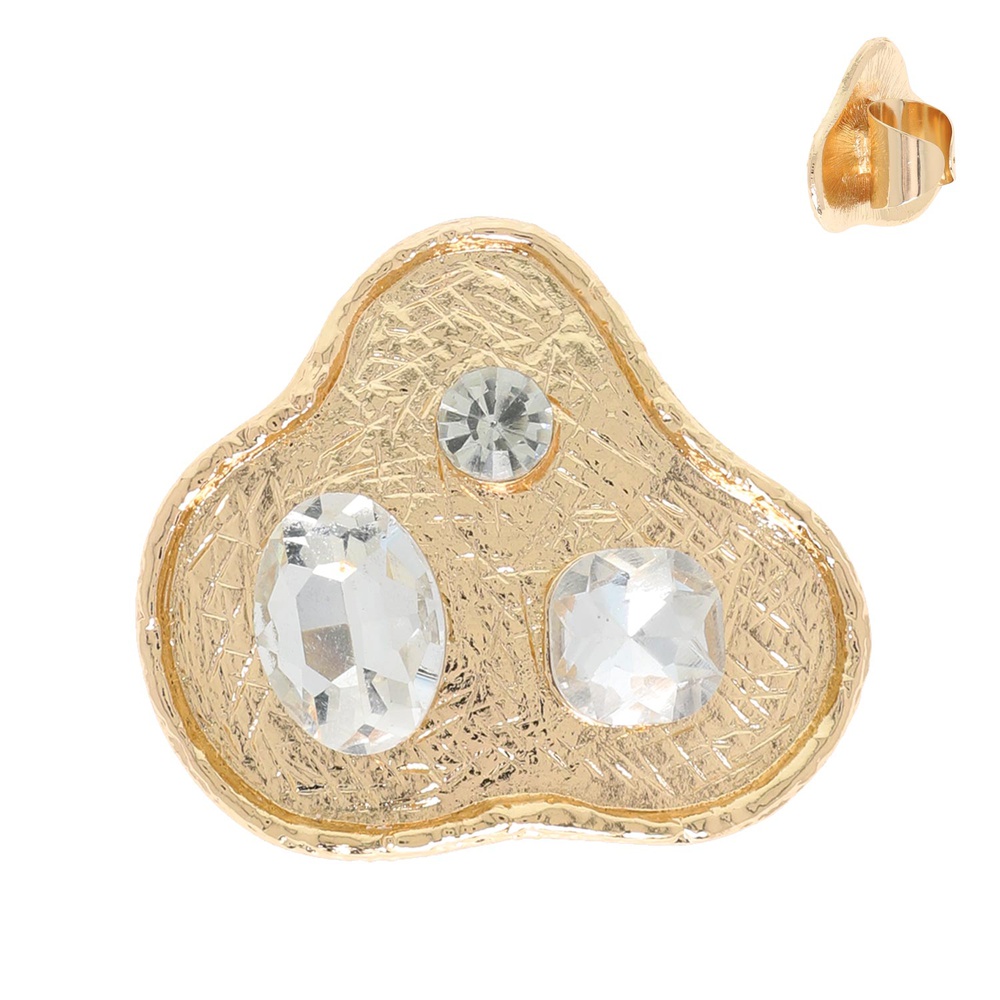 THREE STONE CRYSTAL GEMSTONE BRUSHED METAL CUFF RING IN GOLD TONE METAL