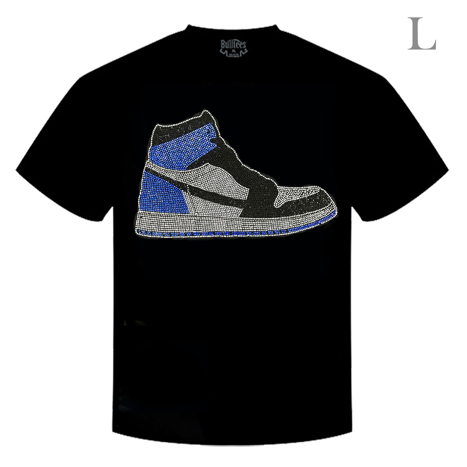 RETRO BLUE BLACK HIGH TOP BASKETBALL SNEAKERS CRYSTAL RHINESTONE STUDDED GRAPHIC CREW NECKLINE SHORT SLEEVE T-SHIRT IN BLACK