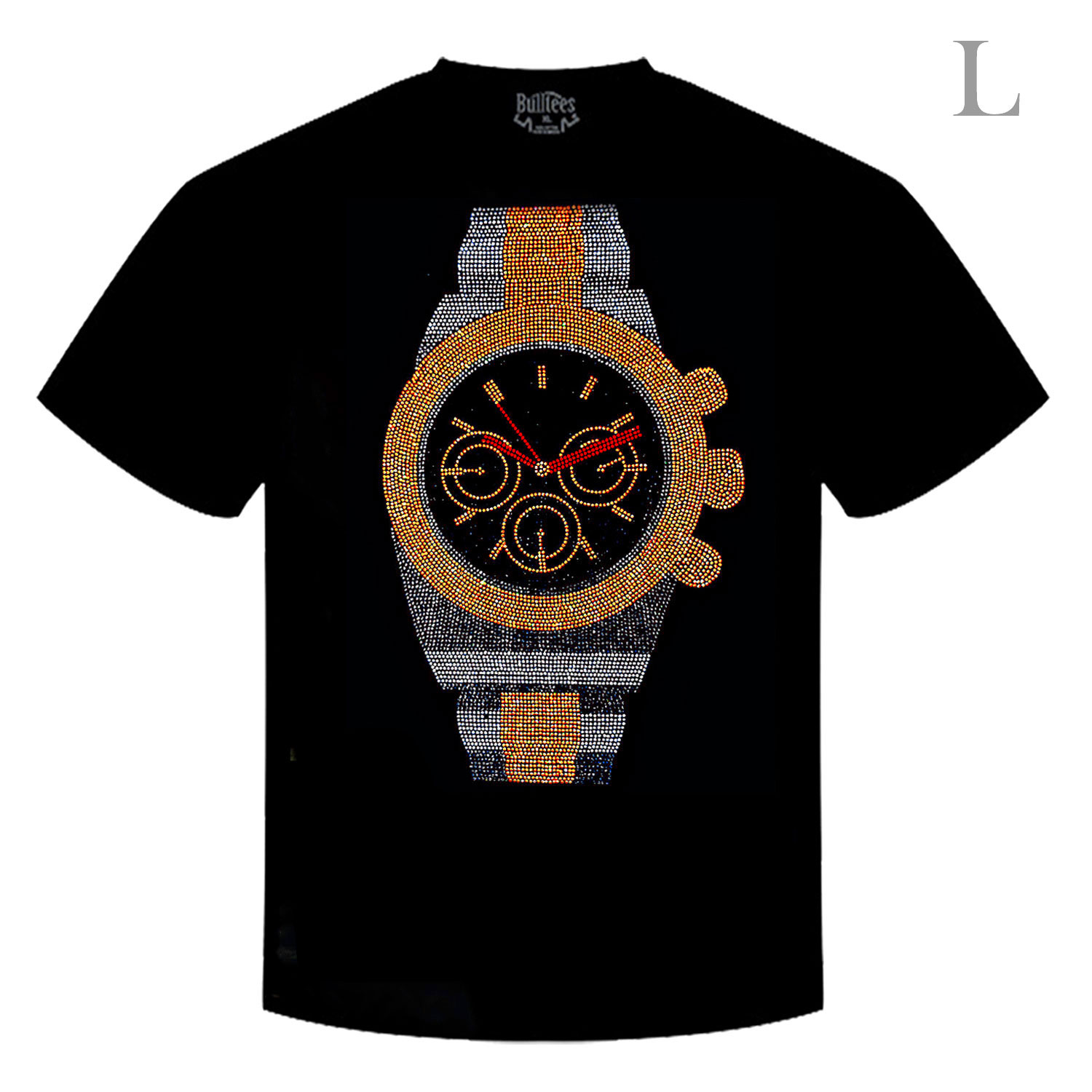 MEN'S WATCH CRYSTAL RHINESTONE STUDDED CREW NECKLINE SHORT SLEEVE GRAPHIC T-SHIRT IN BLACK