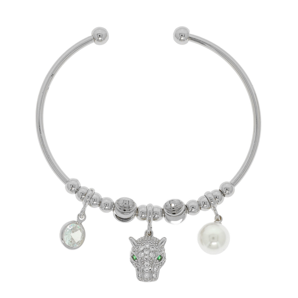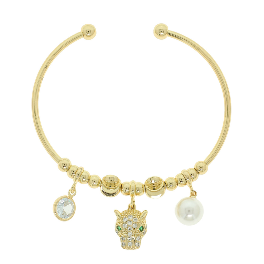 MULTI CHARM CUFF BRACELET WITH CUBIC ZIRCONIA LEOPARD HEAD PEARL TRINKETS