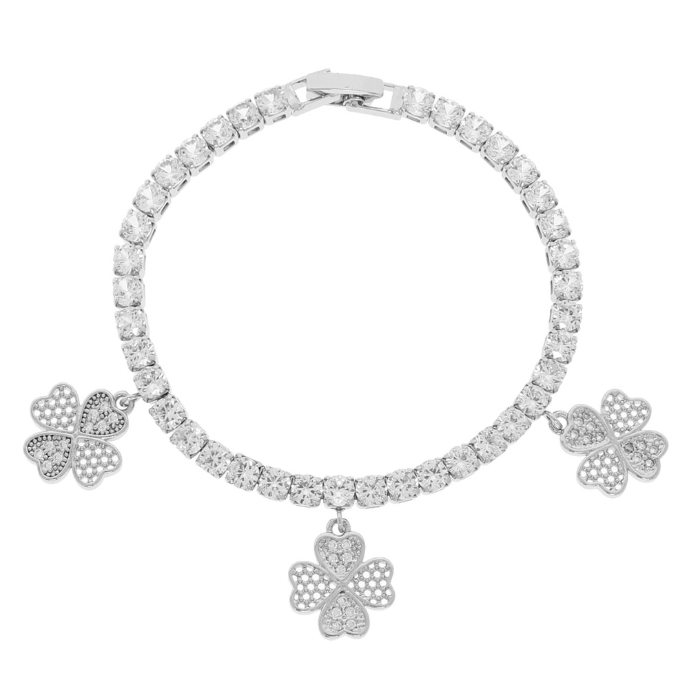 CUBIC ZIRCONIA PAVE CLOVER CHARM TENNIS BRACELET IN SILVER TONE METAL