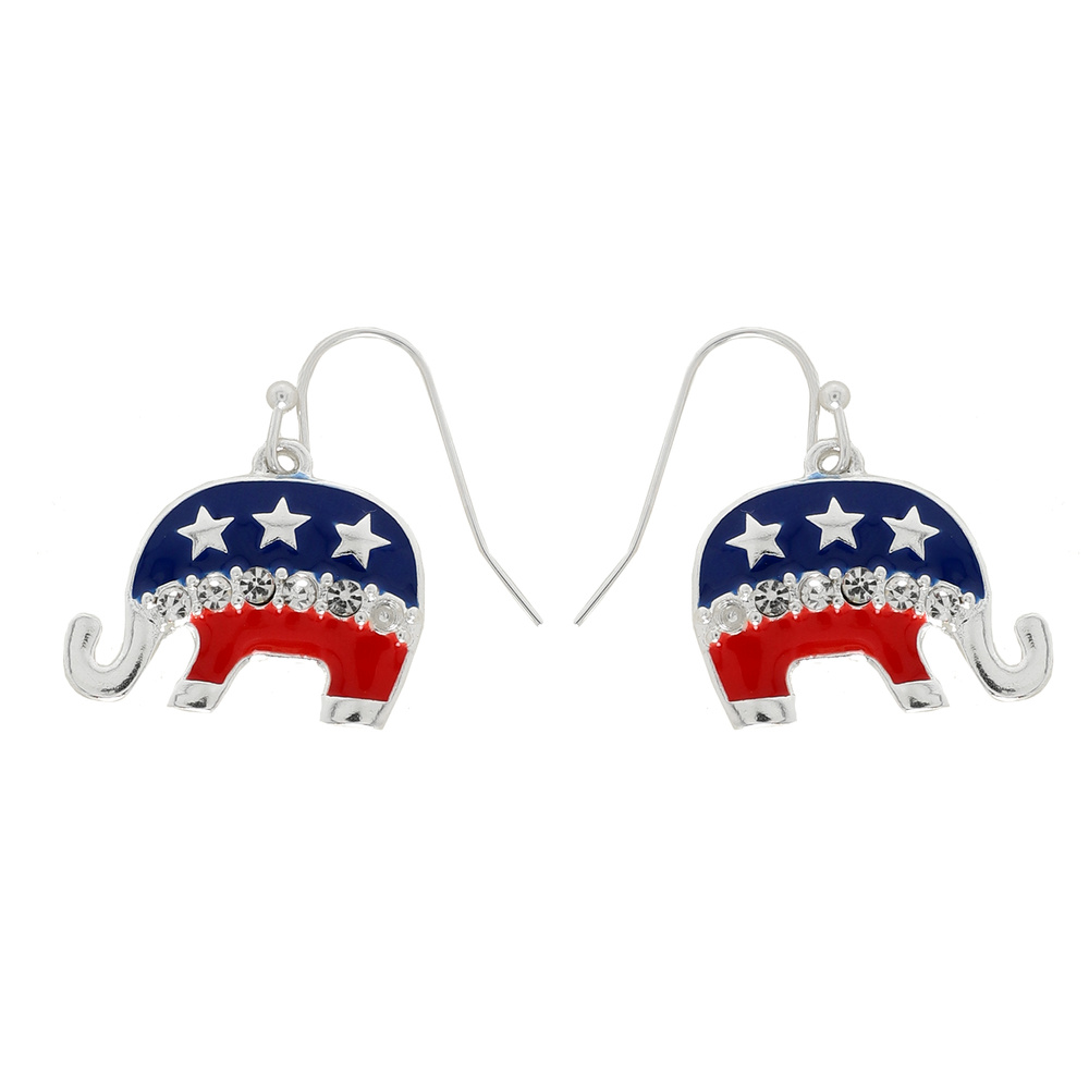 SILVER-TONE PATRIOTIC GOP RNC U.S. FLAG ENAMEL EPOXY RHINESTONE ELEPHANT POLISHED DANGLE FISHHOOK EARRINGS