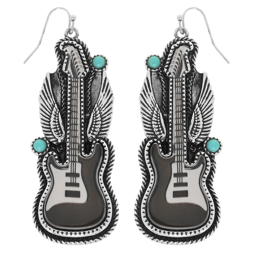 WESTERN WINGED ELECTRIC GUITAR POST DANGLE EARRINGS WITH TURQUOISE ACCENTS