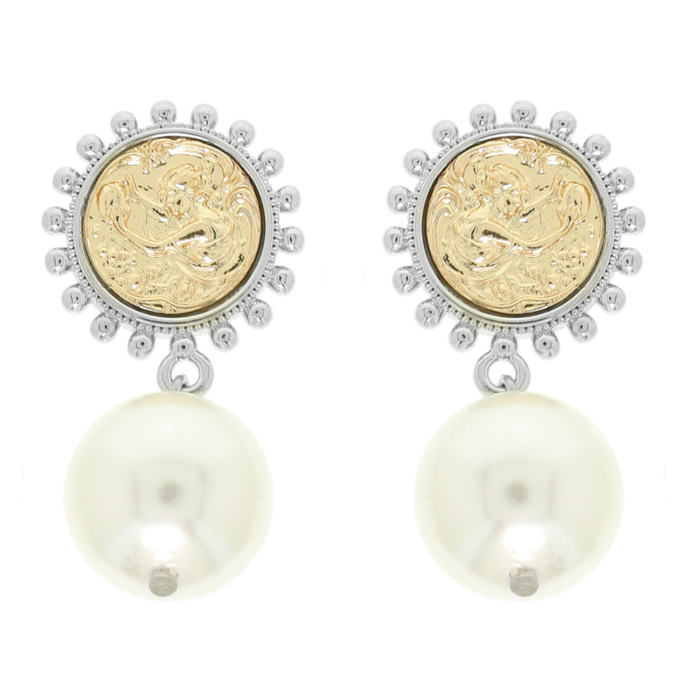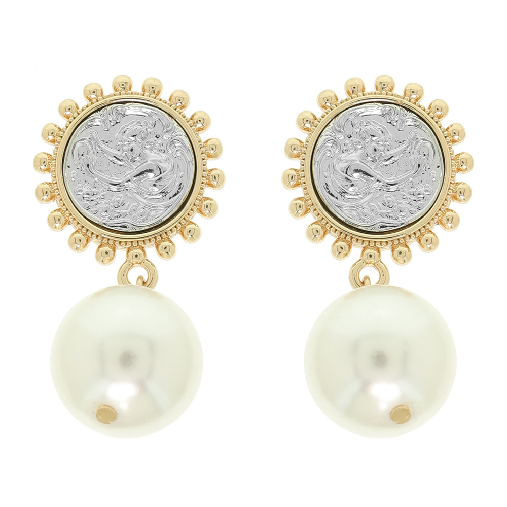 TWO TONE COIN PEARL DROP STUD EARRINGS IN GOLD TONE METAL