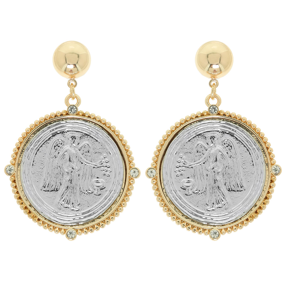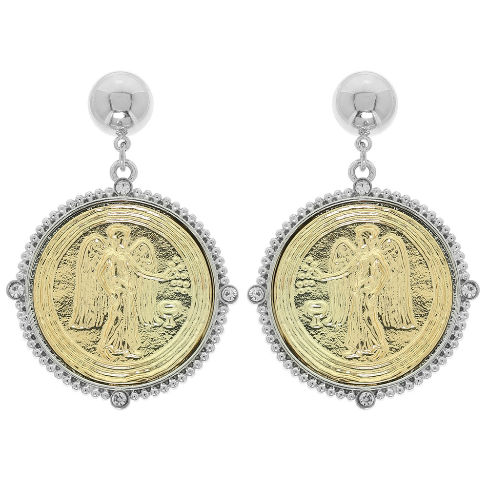 TWO TONE ANGEL COIN MEDALLION POST DANGLE EARRINGS WITH RHINESTONE ACCENTS