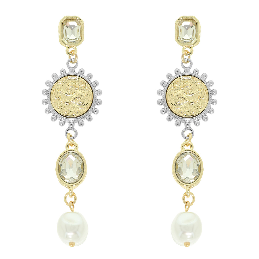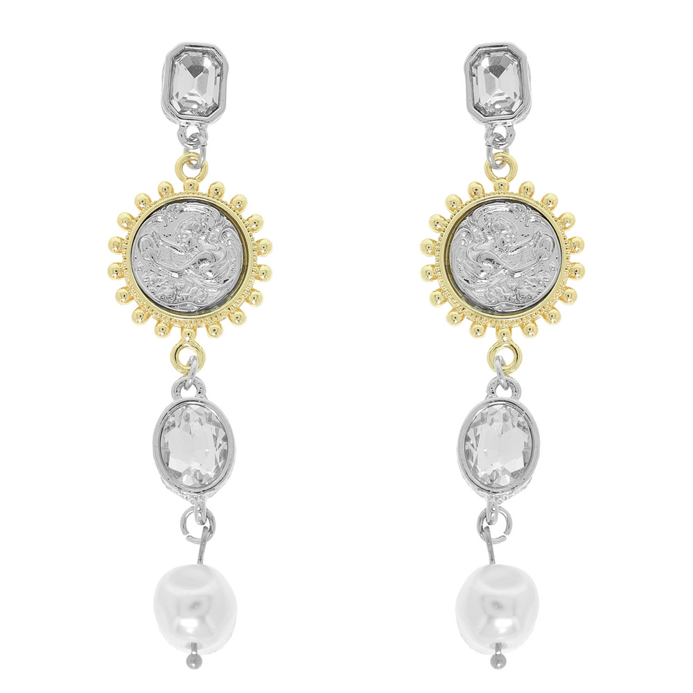 TWO TONE ANGEL COIN POST DANGLE EARRINGS WITH CRYSTAL LINKS AND PEARL DROP