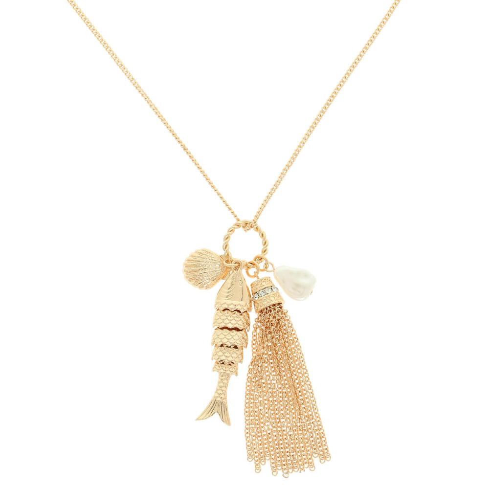 SEA CHARM TASSEL PENDANT NECKLACE WITH SHELL PEARL ACCENT AND FISH CHARM