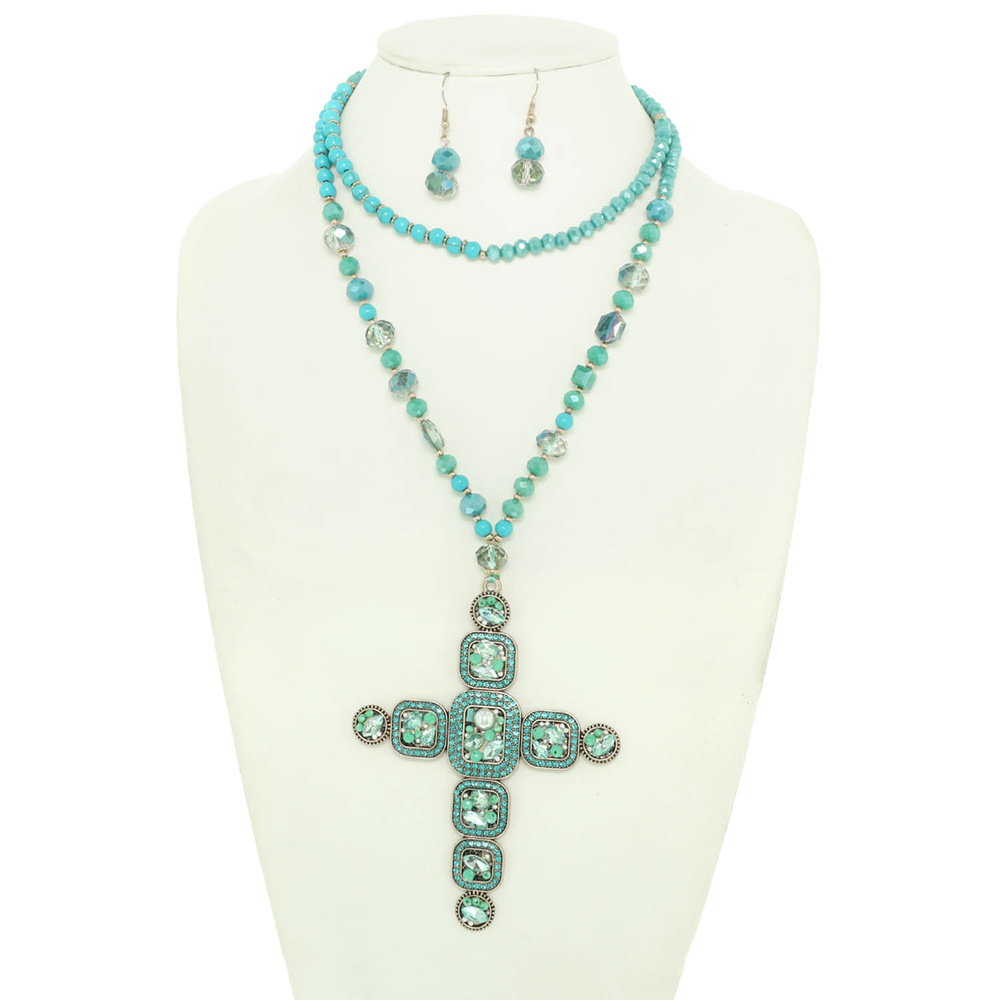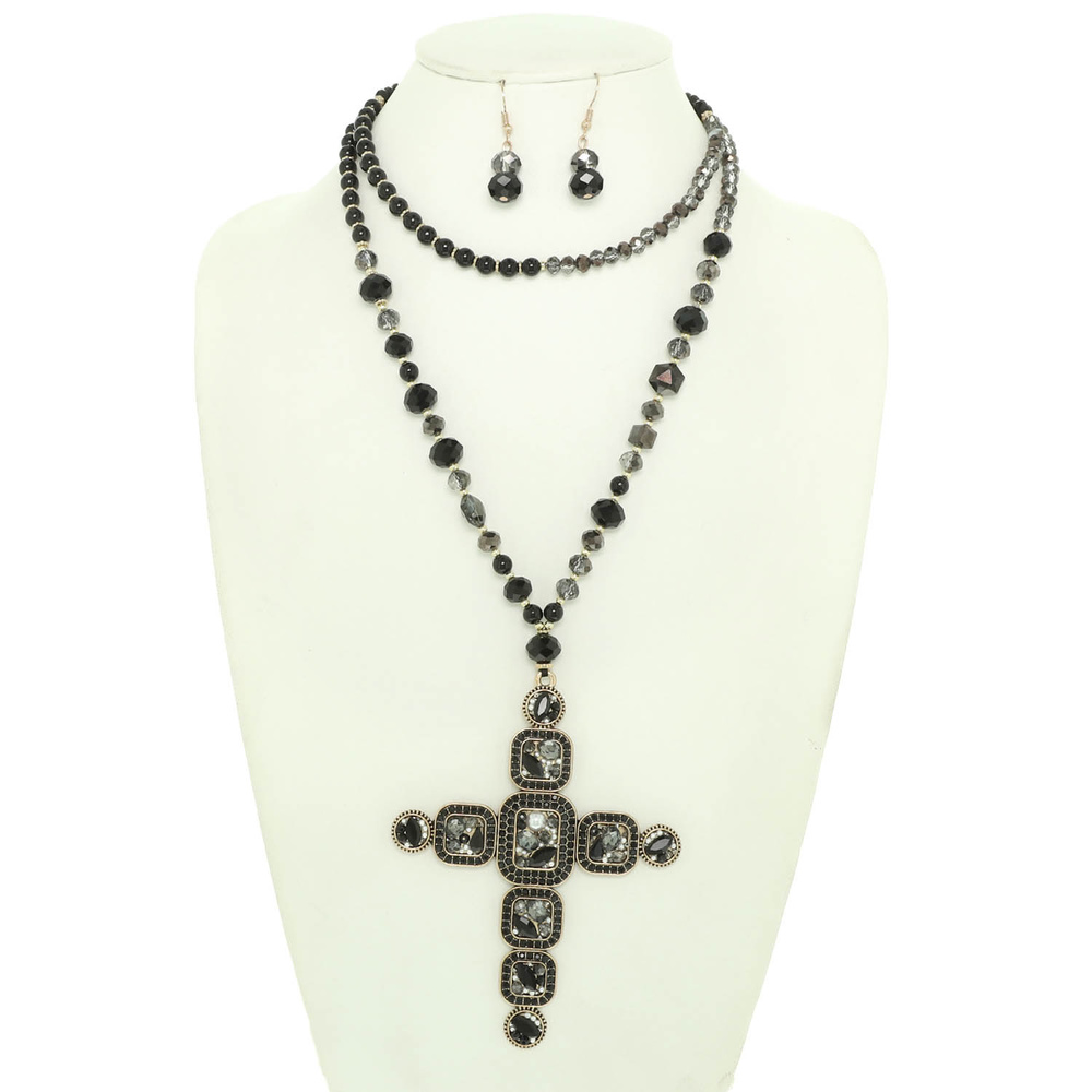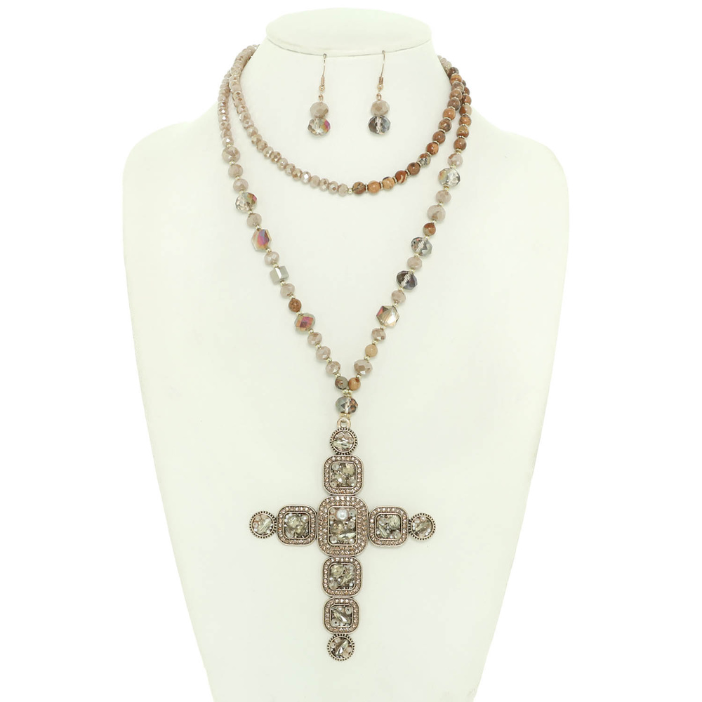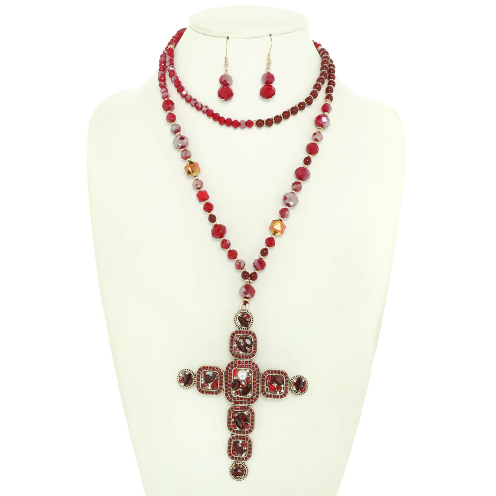CRYSTAL CROSS BEADED PENDANT NECKLACE EARRING SET