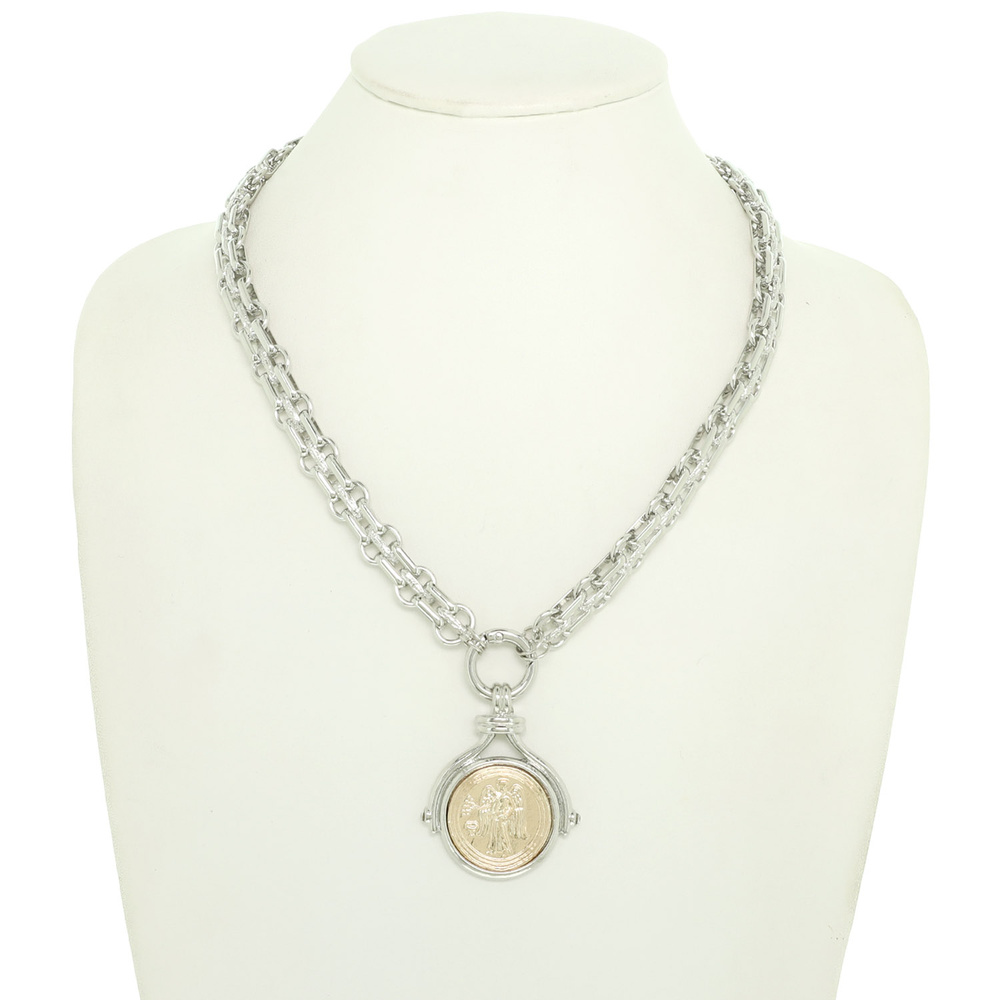 TWO TONE ANGEL COIN PENDANT NECKLACE IN GOLD TONE AND SILVER TONE METAL
