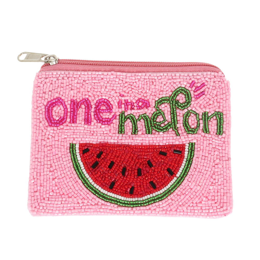 ONE IN A MELON ZIP COIN BAG WITH SEED BEADED DESIGN