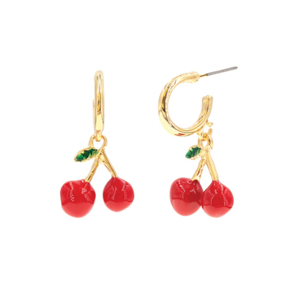 RED EPOXY CHERRY POST DANGLE HOOP EARRINGS IN GOLD-TONE METAL
