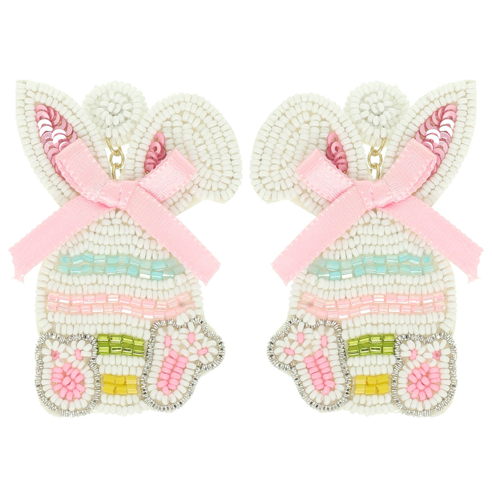 EASTER BUNNY POST DANGLE EARRINGS WITH SEED BEADED AND BOW DETAIL