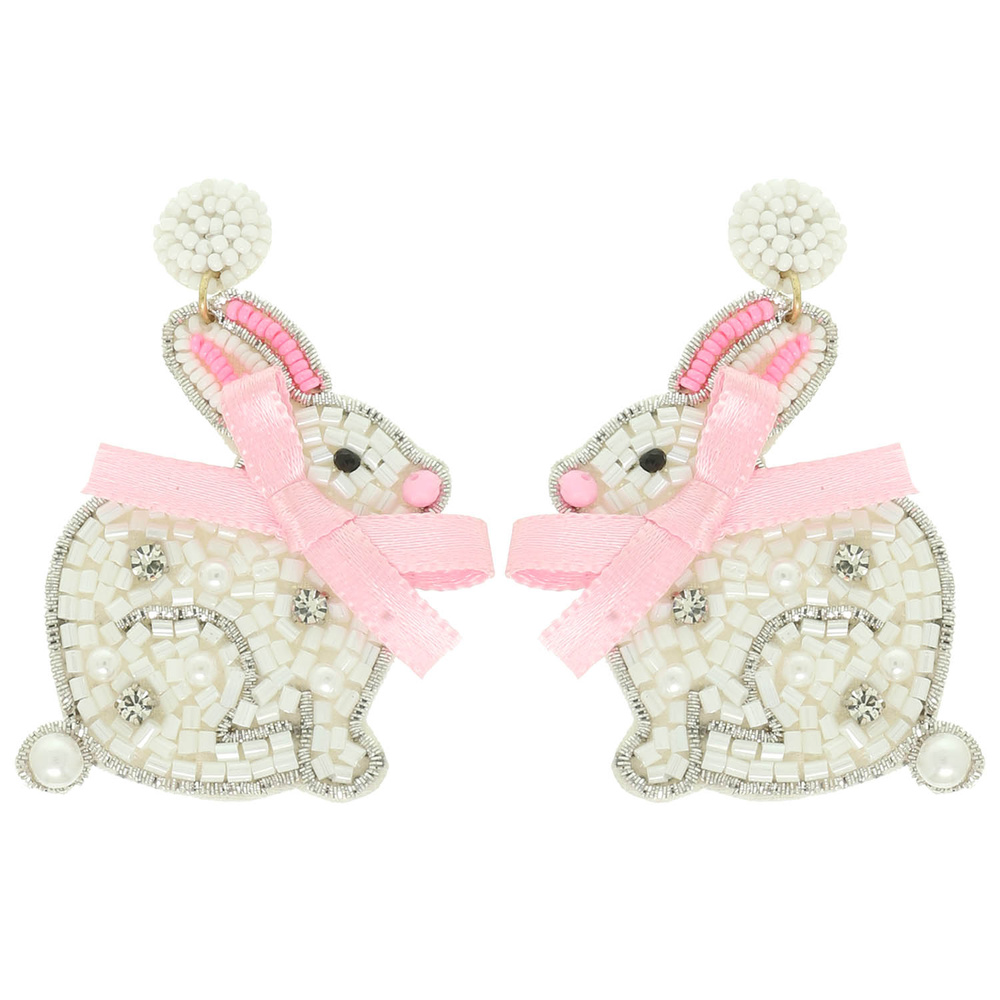 EASTER BUNNY SEED BEADED POST DANGLE EARRINGS WITH PEARL AND CRYSTAL ACCENTS