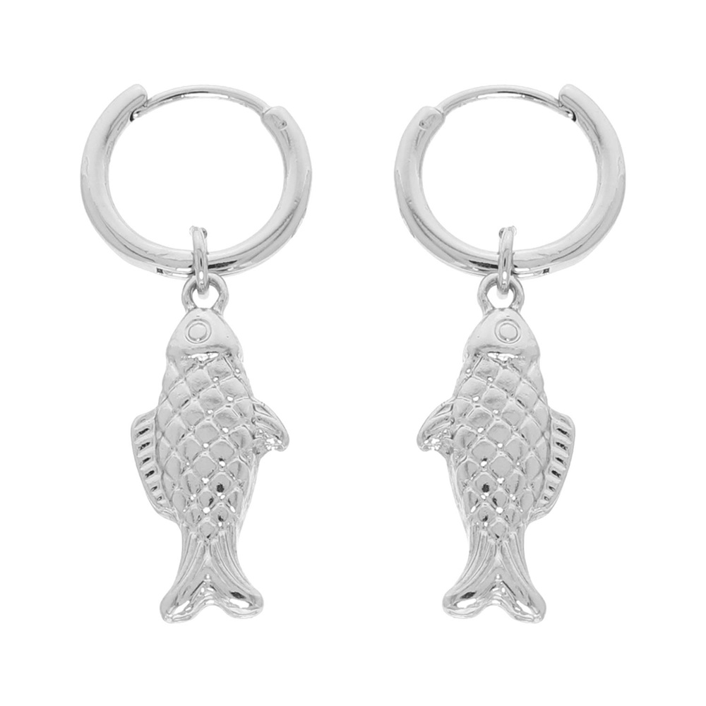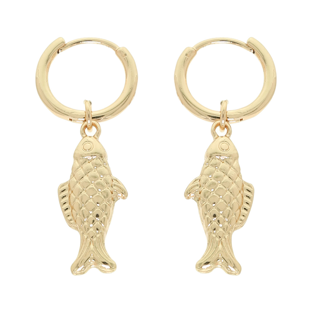 TEXTURED FISH CHARM HUGGIE HOOP EARRINGS IN GOLD TONE METAL