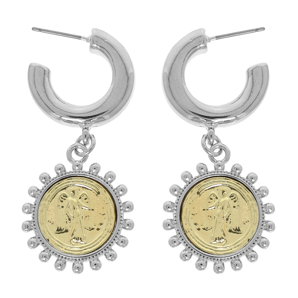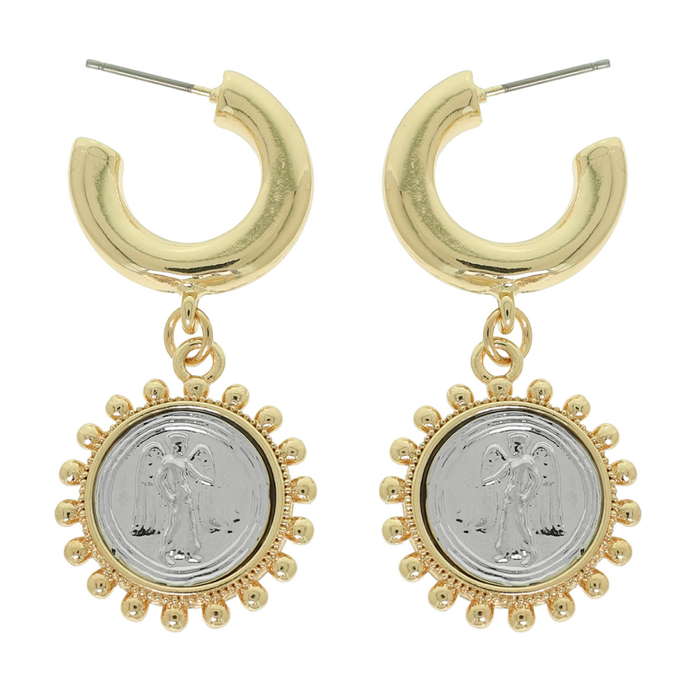 TWO-TONE SAINT MEDALLION HUGGIE HOOP EARRINGS WITH BEADED FRAME