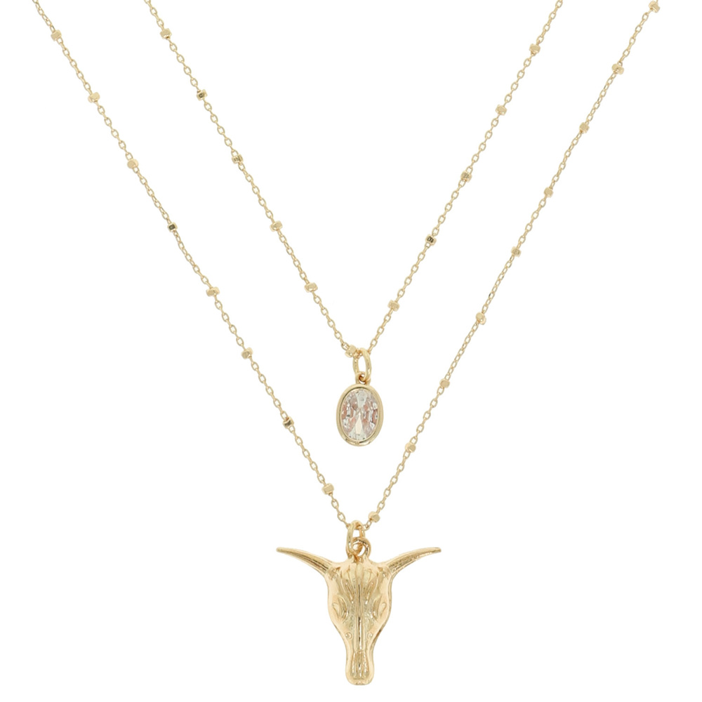 WESTERN LAYERED LONGHORN SKULL PENDANT NECKLACE WITH OVAL STONE
