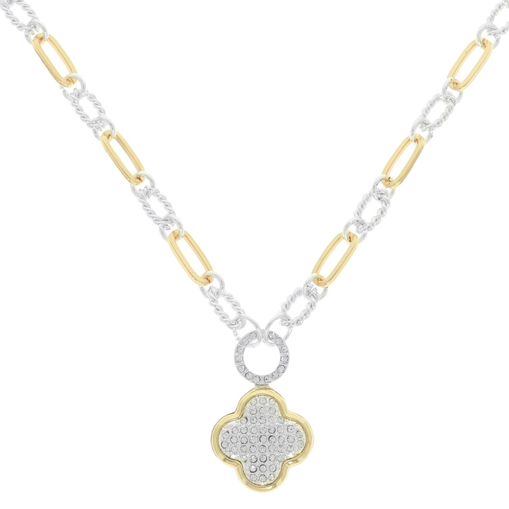 TWO TONE LINK NECKLACES WITH RING CONNECTOR AND RHINESTONE PAVE QUATREFOIL PENDANT