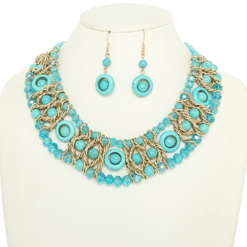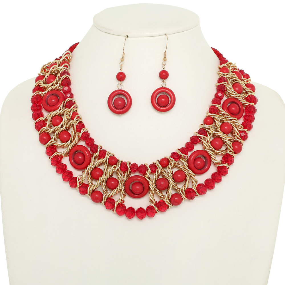 MULTICOLOR SPHERICAL BEADED NECKLACE EARRING SET WITH GOLD TONE METAL