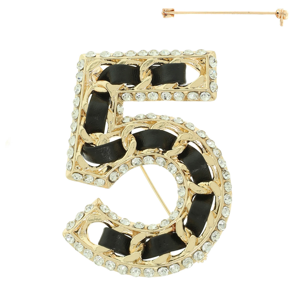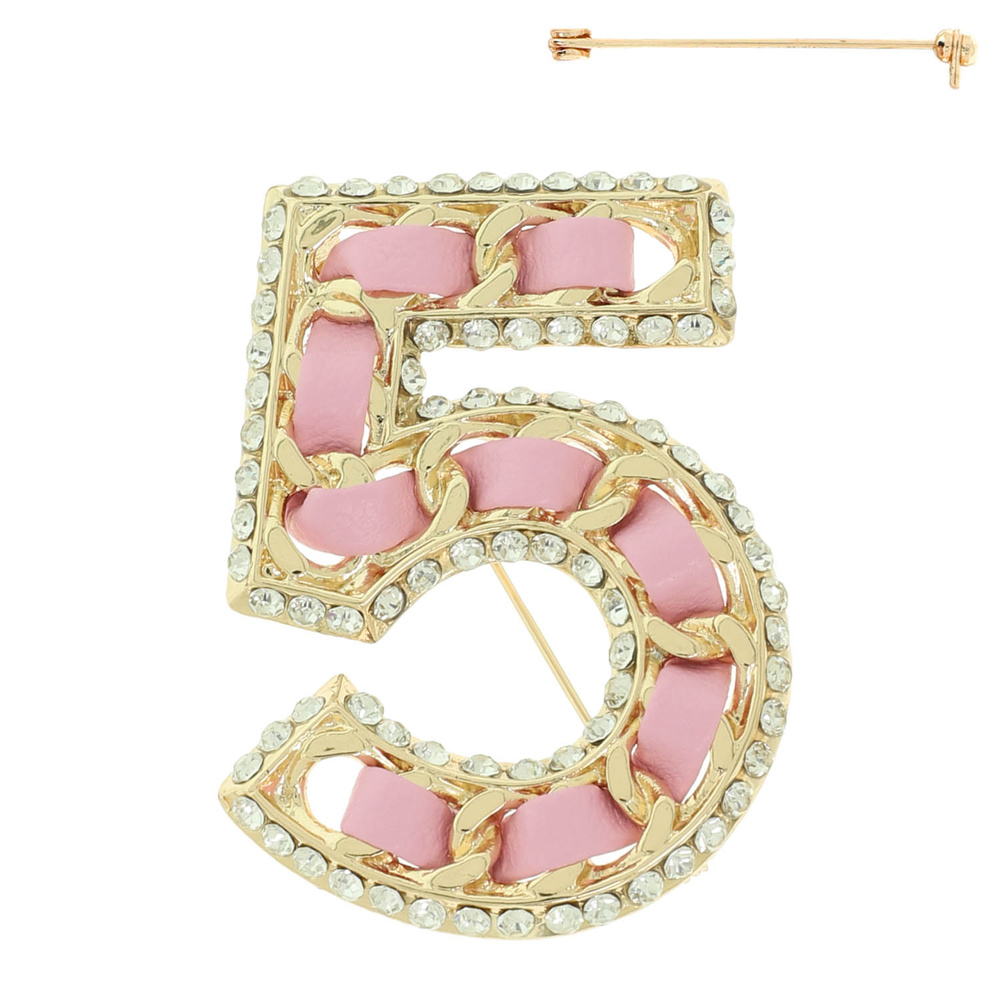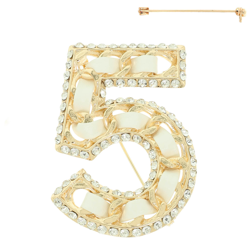 NUMBER FIVE CRYSTAL BROOCH PIN WITH WOVEN FABRIC PANEL