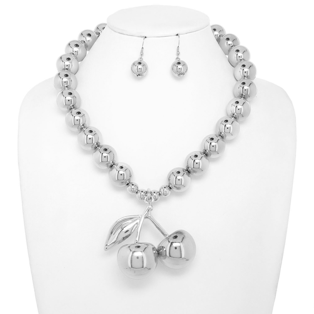 POLISHED CHERRY PENDANT NECKLACE WITH EARRING SET IN GOLD-TONE AND SILVER-TONE OPTIONS