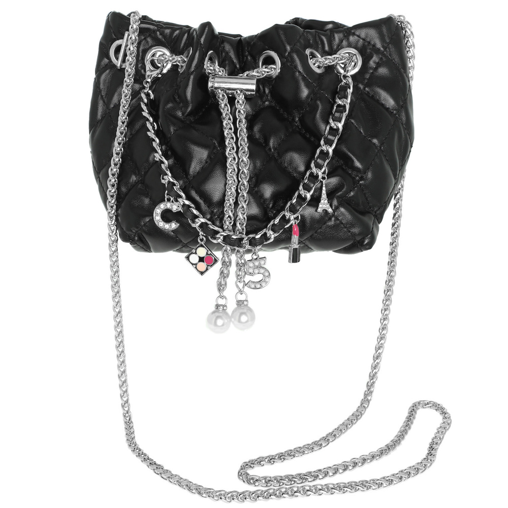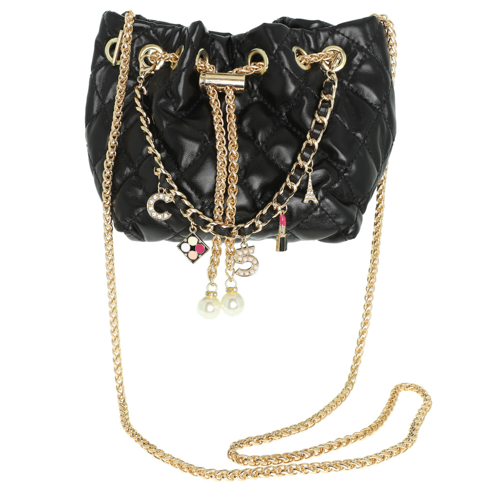 Fashionista Multi Jeweled Charm Textured Leather Bucket Bag With Chain Straps