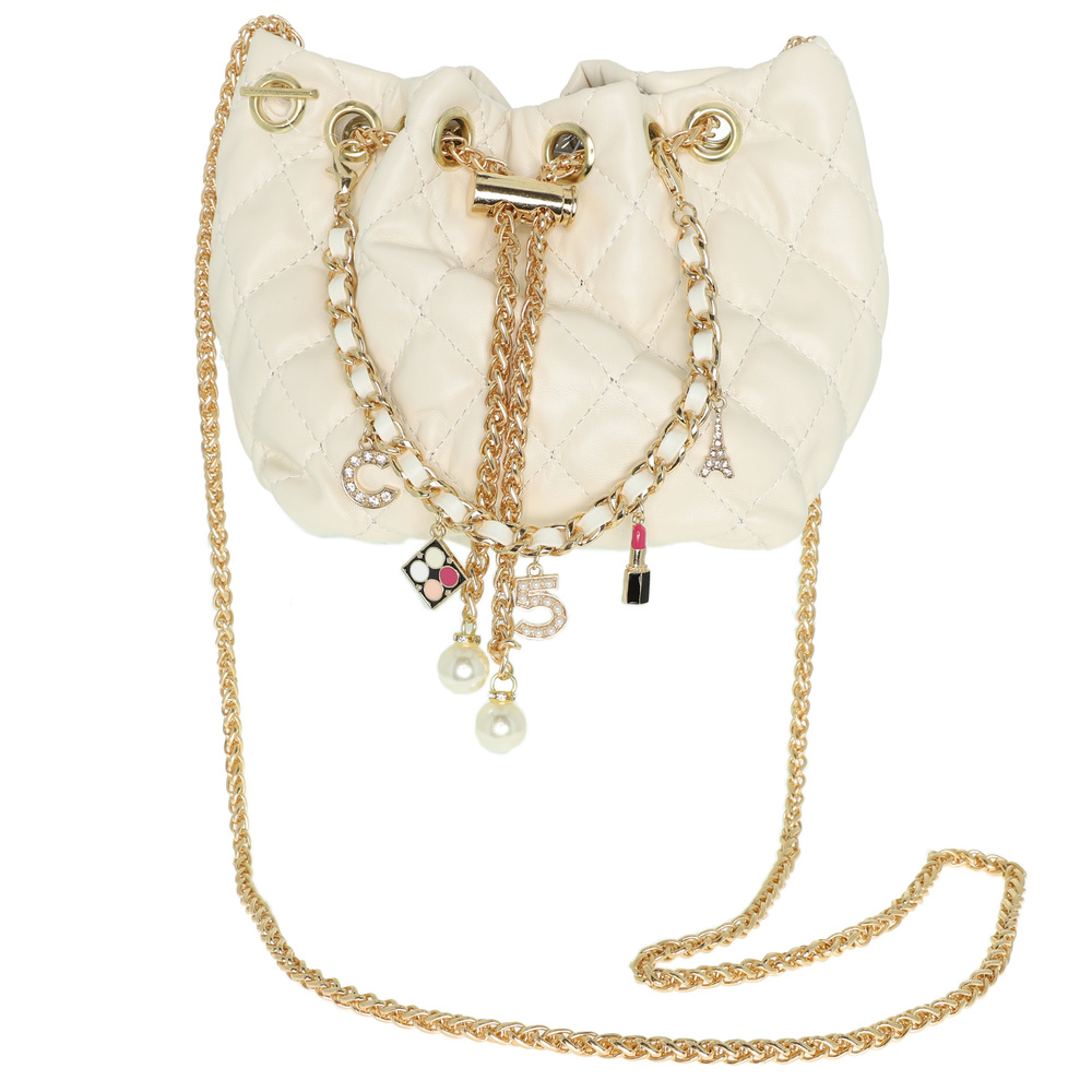 FASHIONISTA MULTI JEWELED CHARM TEXTURED LEATHER BUCKET BAG WITH CHAIN STRAPS