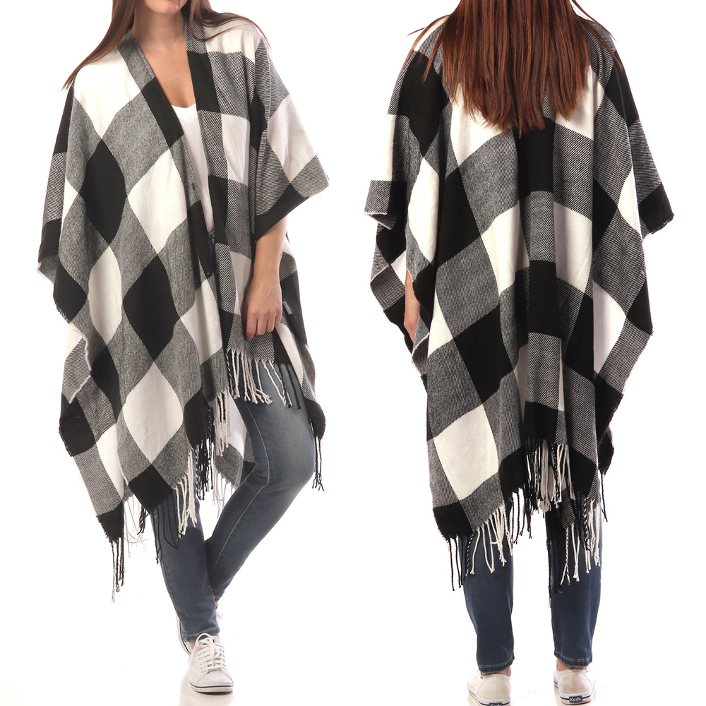 Plaid Pattern Winter Fringe Pashmina Poncho Wrap