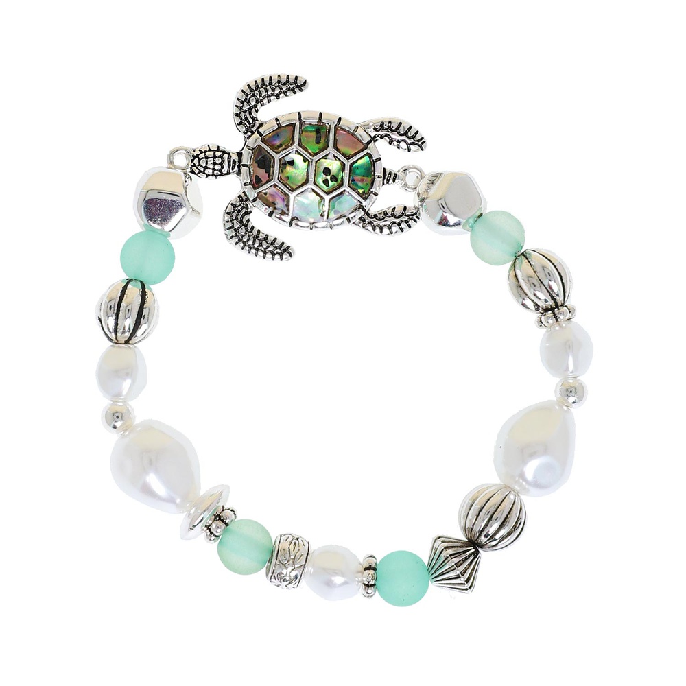 TURTLE ABALONE SEA LIFE SEA GLASS AND PEARL BEADED STRETCH BRACELET IN SILVER TONE METAL