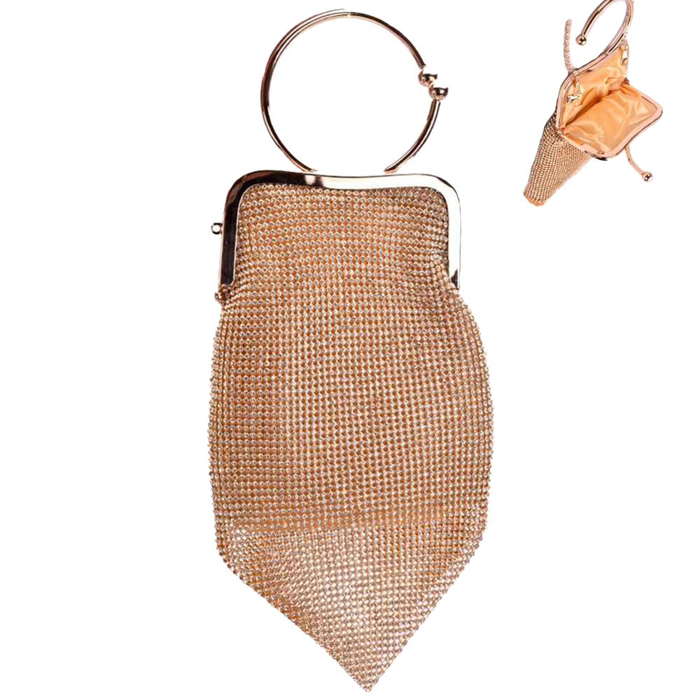 Crystal Rhinestone Ring Wristlet Mesh Evening Clutch Purse With Detachable Metal Chain Strap